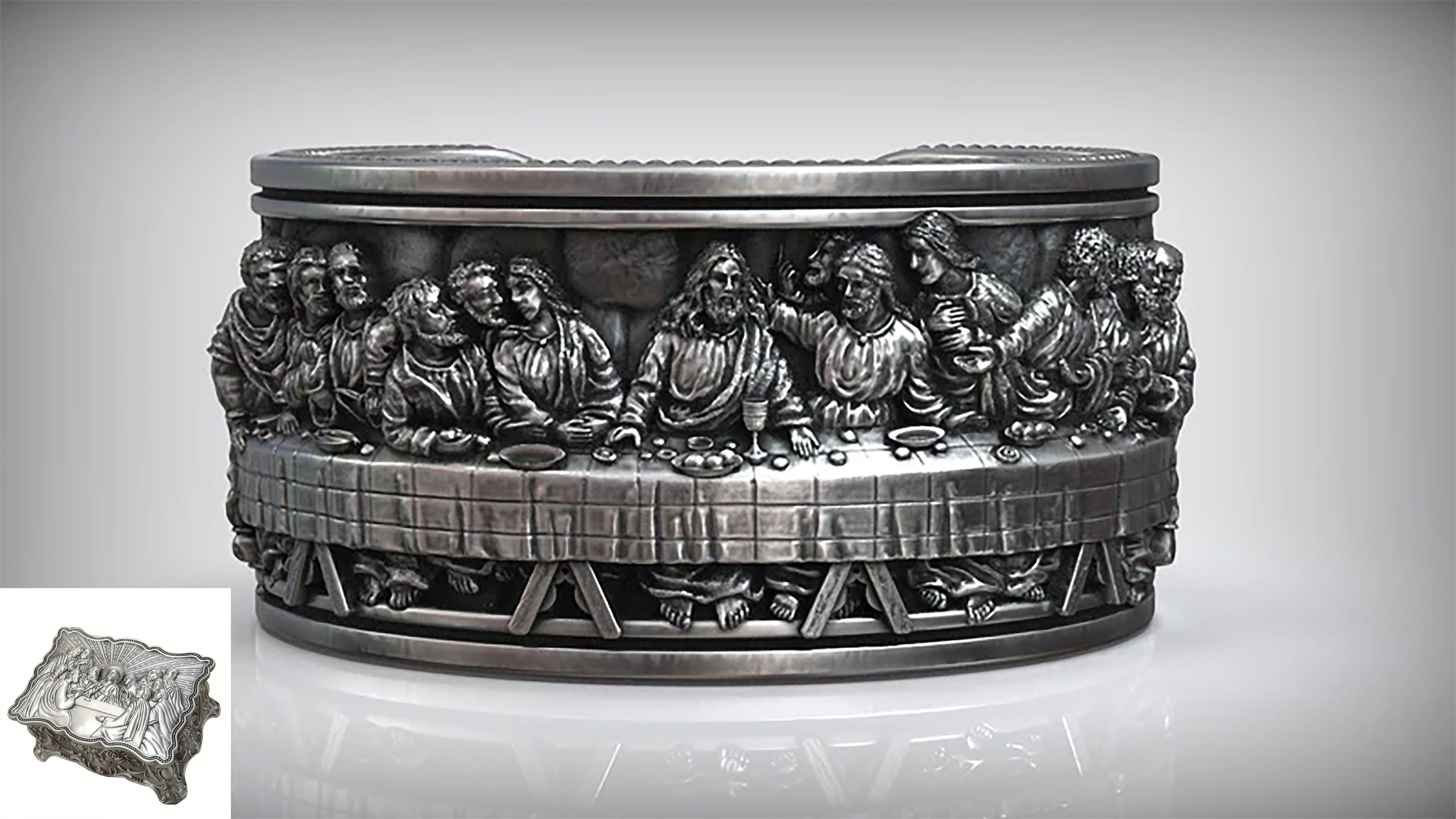 • The surface is treated with a vintage finish, emphasizing the weight and solemnity of the silverwork and the sacred theme.