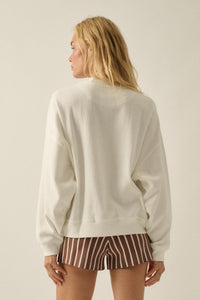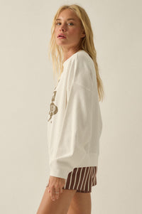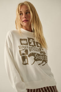 • Vintage-style western motif graphic print with cowboy hat, cowboy boots, horse, and text that reads: "Wander Western Saddle Up".