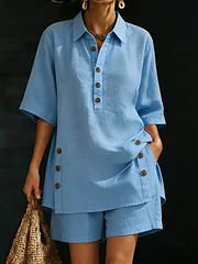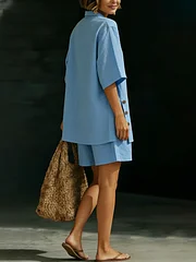 The loose-fitting button-up shirt paired with breathable shorts creates a casual yet stylish outfit that’s perfect for everyday wear. Whether you're heading out for brunch, beach vacations, or weekend errands, this set delivers comfort and elegance in one easy look.