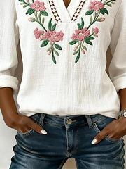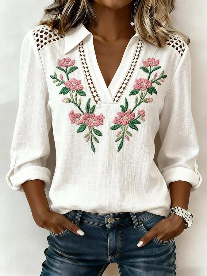 Women's Casual Collared Hollow-Out Printed Cotton Linen Top