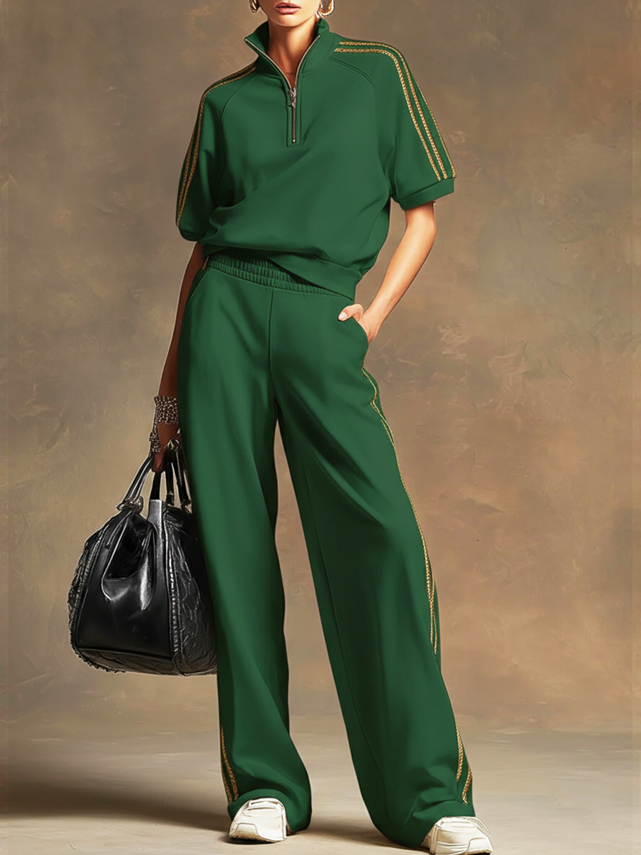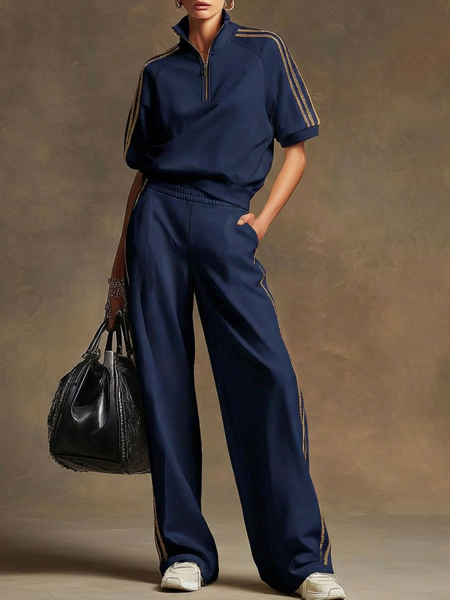 Women's Casual Patchwork Striped Half-zip Short-sleeved Sweatshirt And Pants Two-piece Set