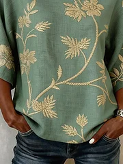 Women's Casual Round Neck Printed Cotton Linen Top