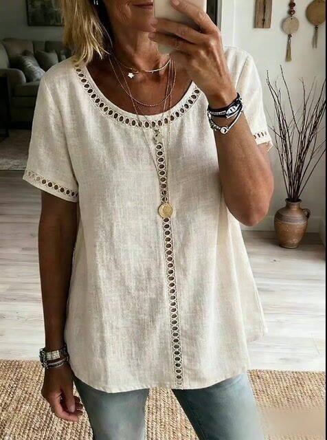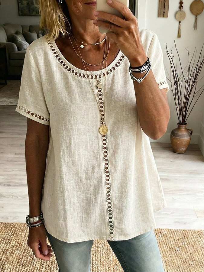 Women's Casual Solid Color Cotton Linen Hollow-Out Top