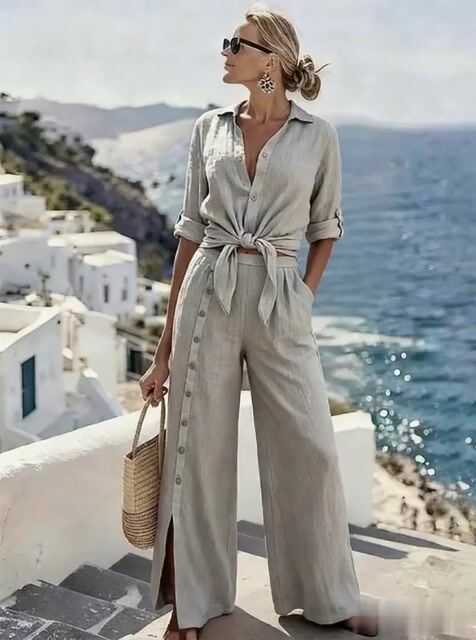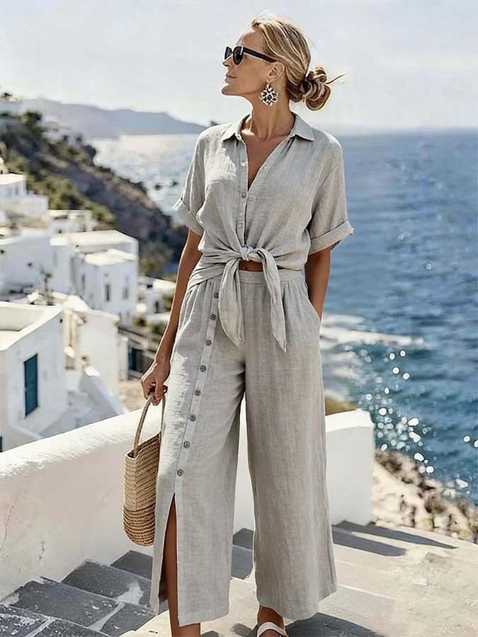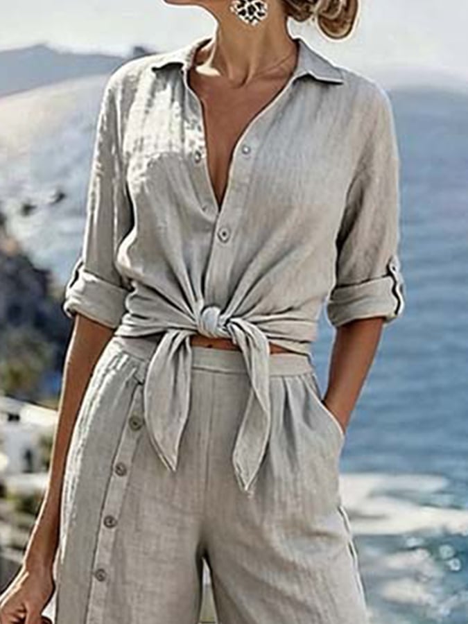 Women'S Casual Solid-Color Shirt And Button-Up Pants Set