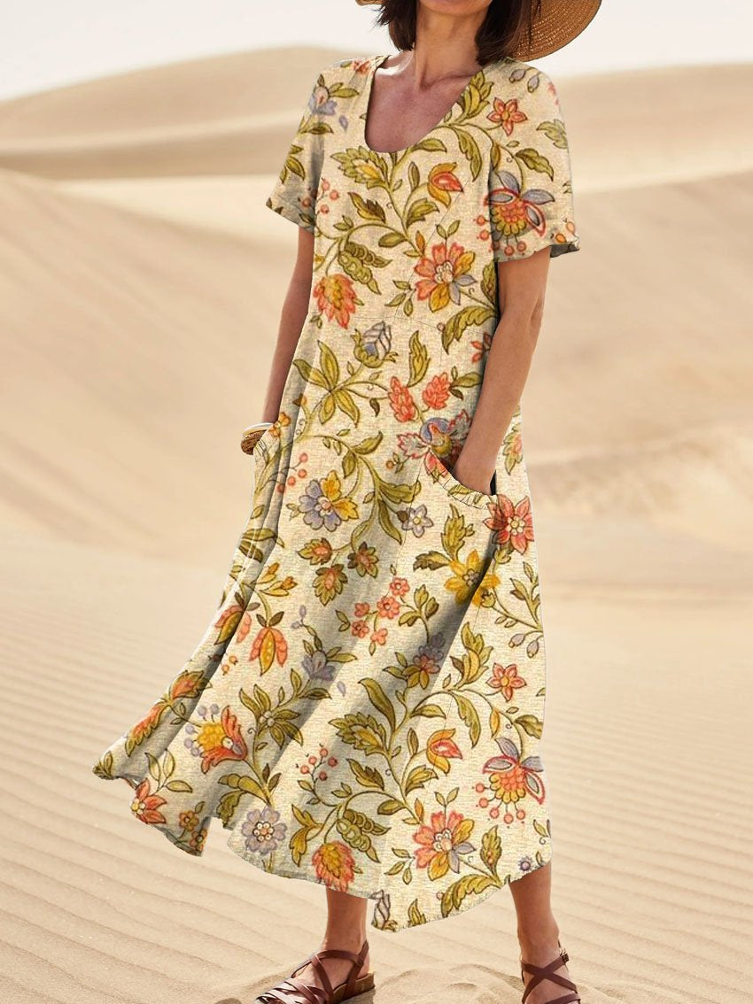 Women's Elegant Flowers Art Print Casual Linen Pocket Dress