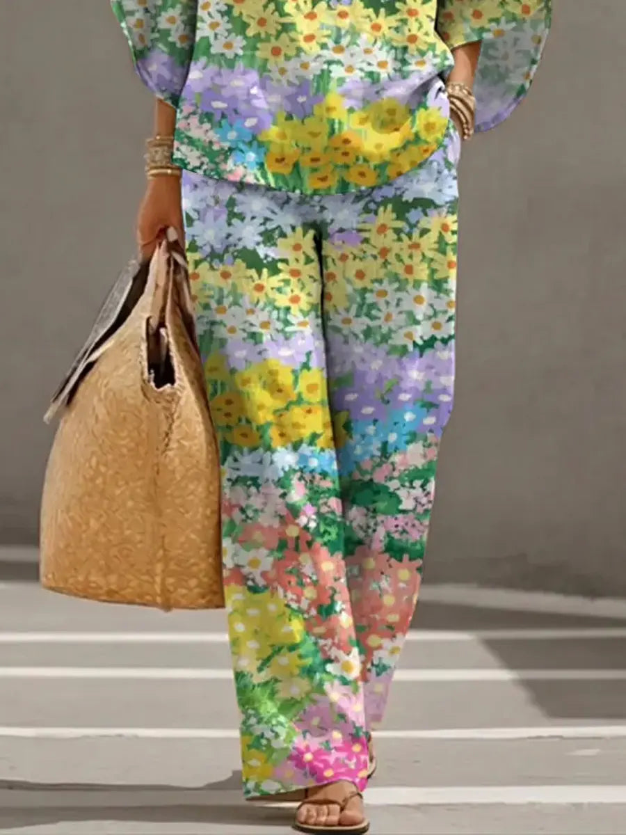 Women's Floral Art Print Casual 3/4 Sleeve Top And Pants Cotton Linen Suits