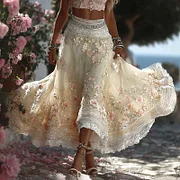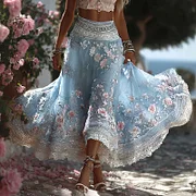 Women's Greece Vacation Greek Key With Floral Art Linen Blend Casual Skirt