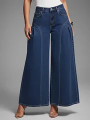 Women's High Waist Pocketed Pleated Wide Leg Loose Casual Denim Pants