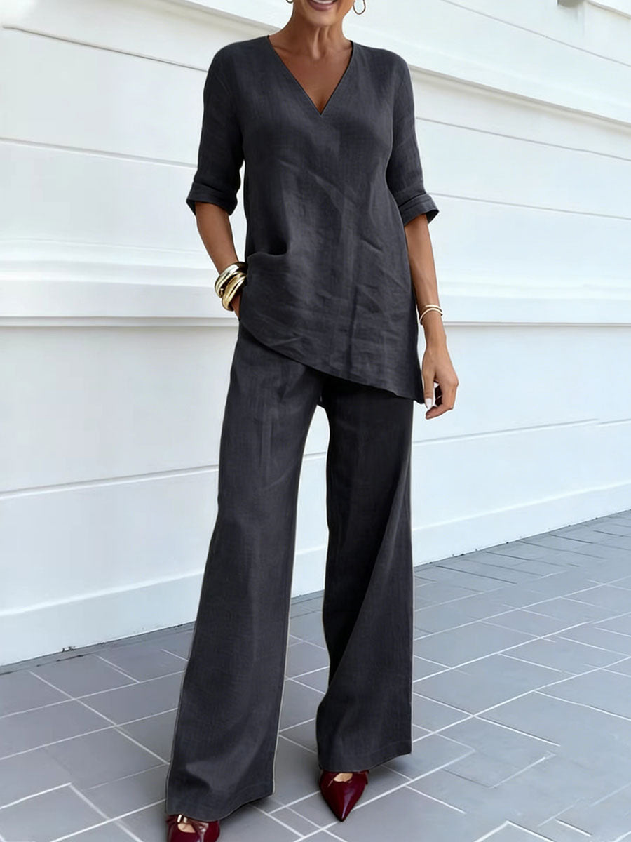 Women's Irregular Loose Solid Color Short-sleeve Wide-leg Pants Two-piece Set