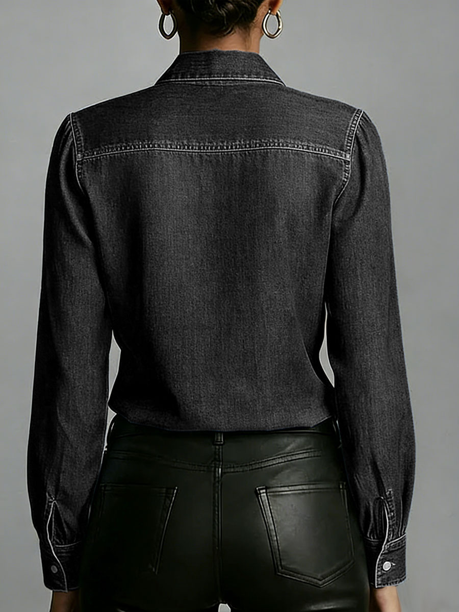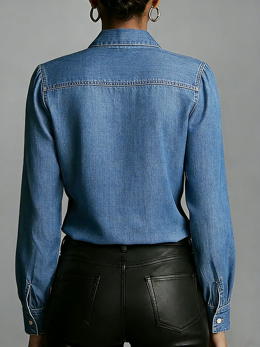 Women's Lapel Collar Ruffled Long-sleeved Loose-fitting Casual Denim Shirt