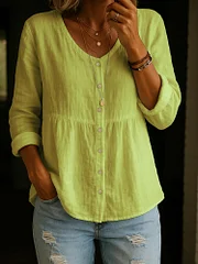 Women's Linen Cotton Blend Shirt - 3/4 Sleeve Crew Neck Loose Hip-Length Casual Blouse