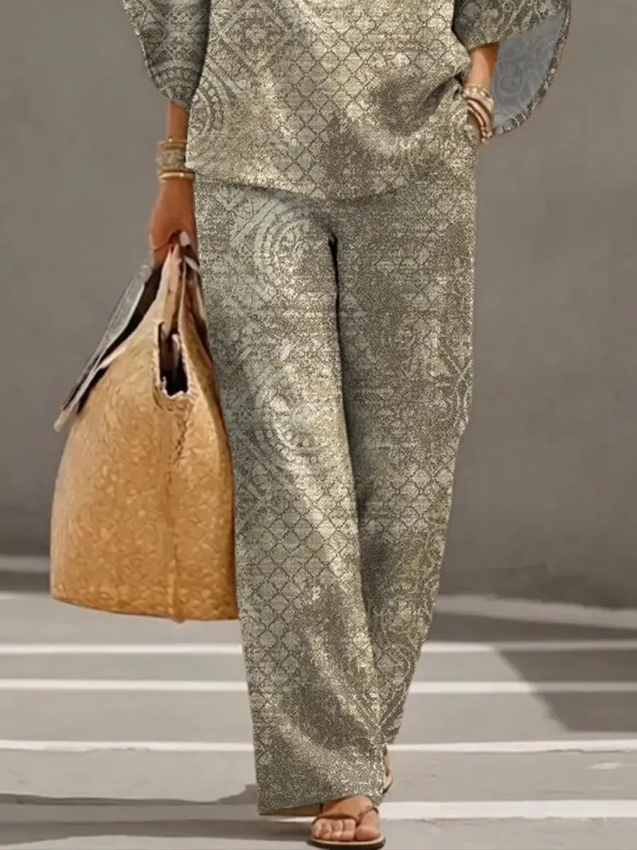 Women's Retro Art Print Casual 3/4 Sleeve Top And Pants Cotton Linen Suits