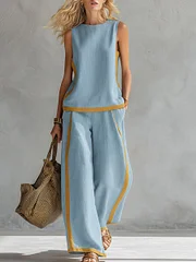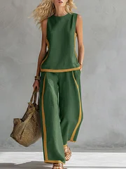 Women's Round Neck Sleeveless Casual Loose Top And High-waisted Loose Wide-leg Pants Cotton And Linen Set.