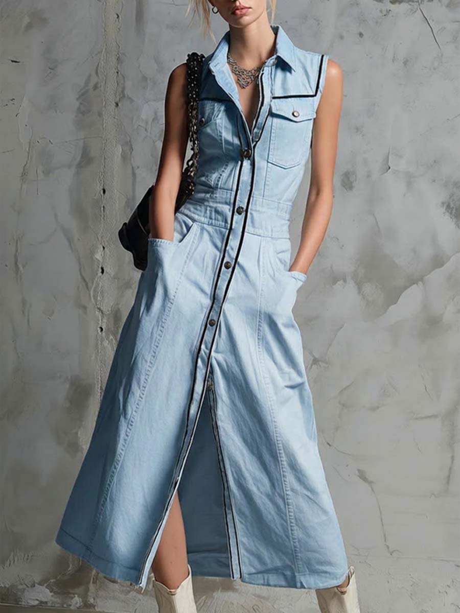 Women's Sleeveless Casual Loose Denim Dress With Lapel Collar