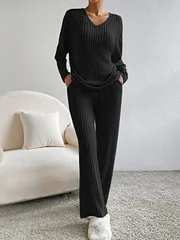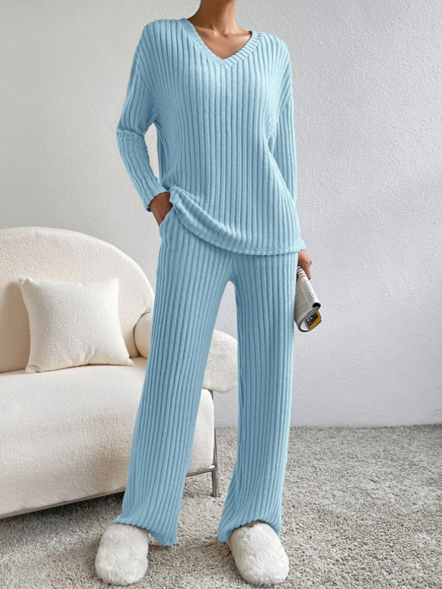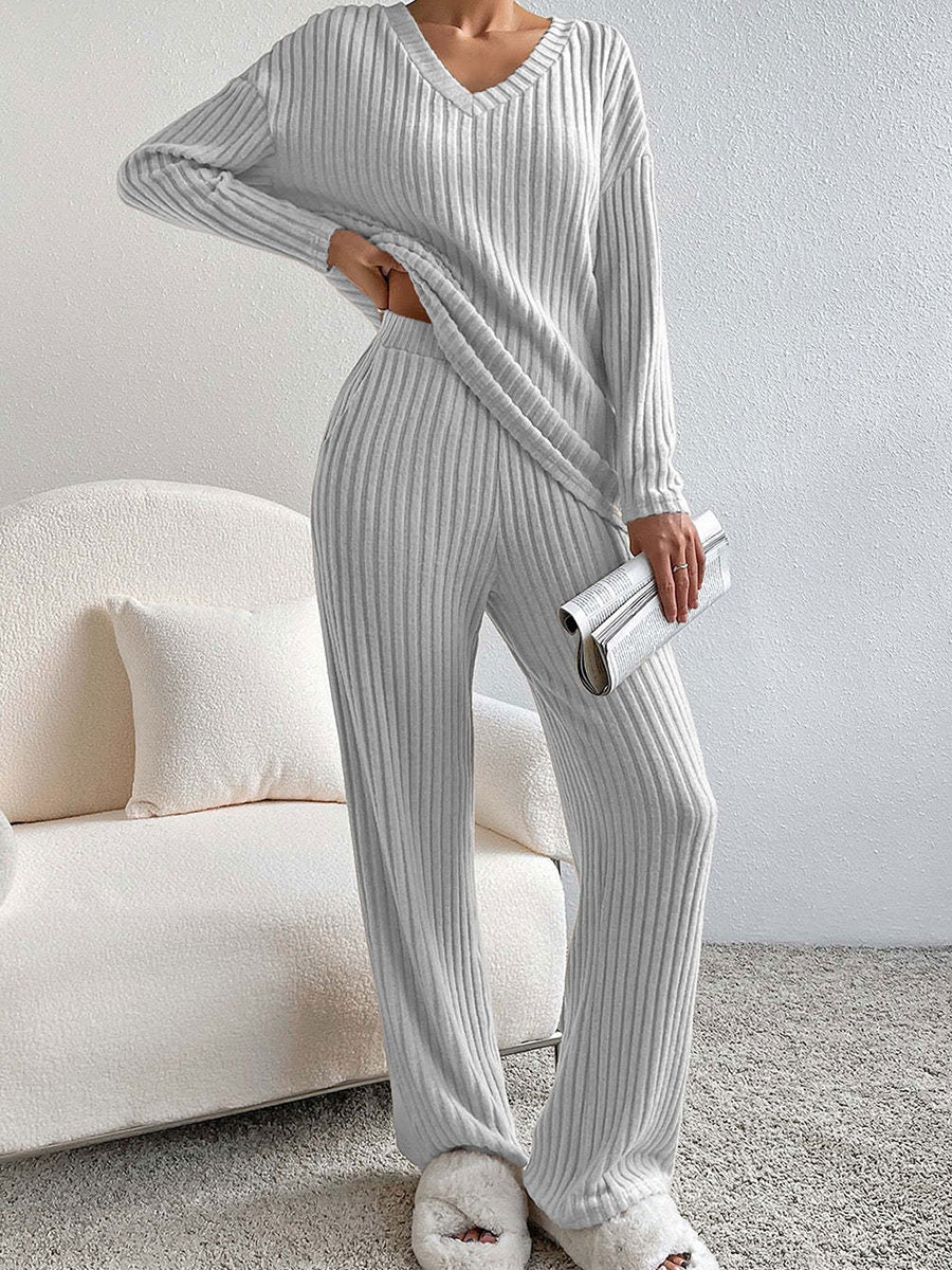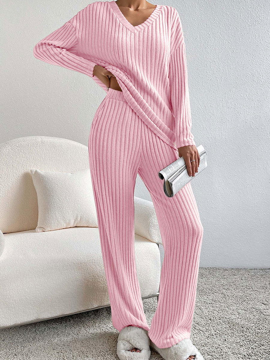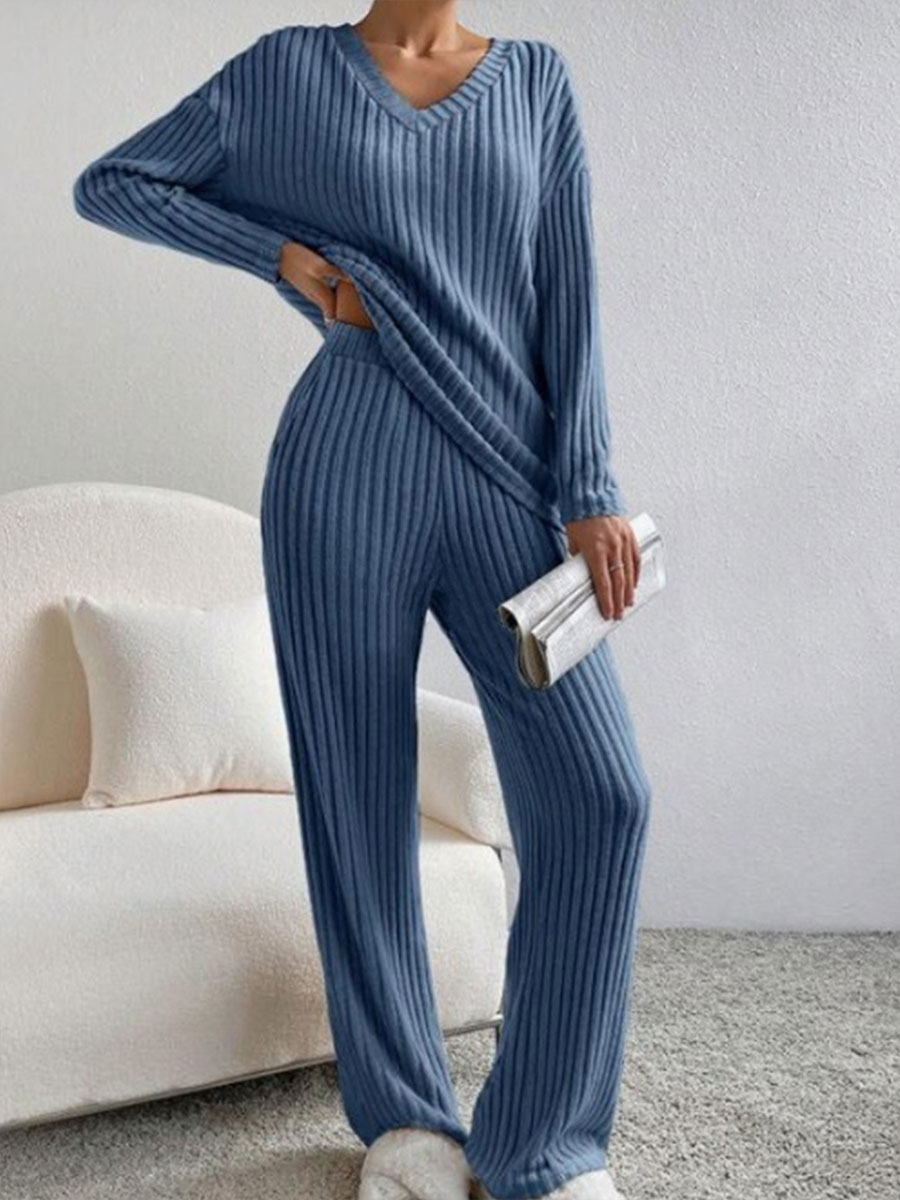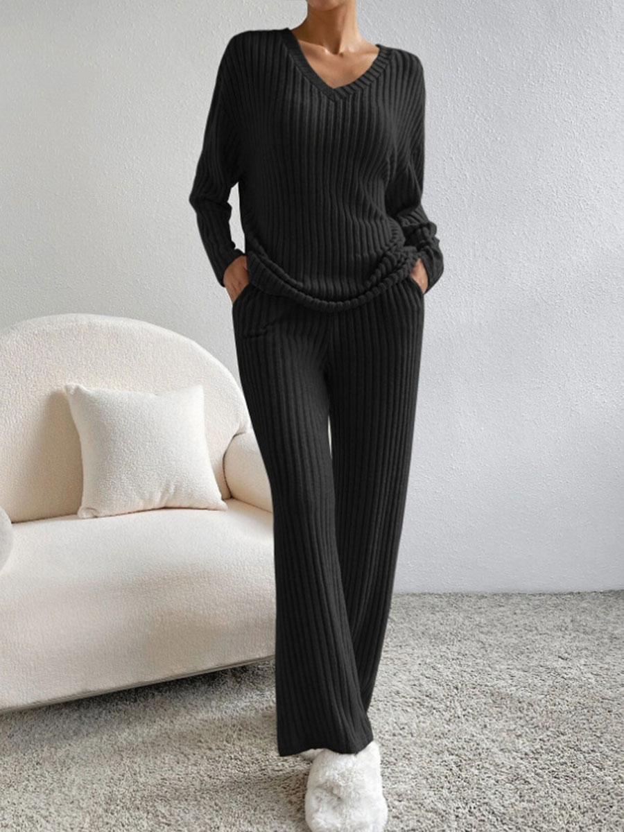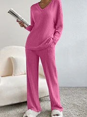 Women's Solid Color Casual Straight Leg Pants Loose V-neck Knit Set