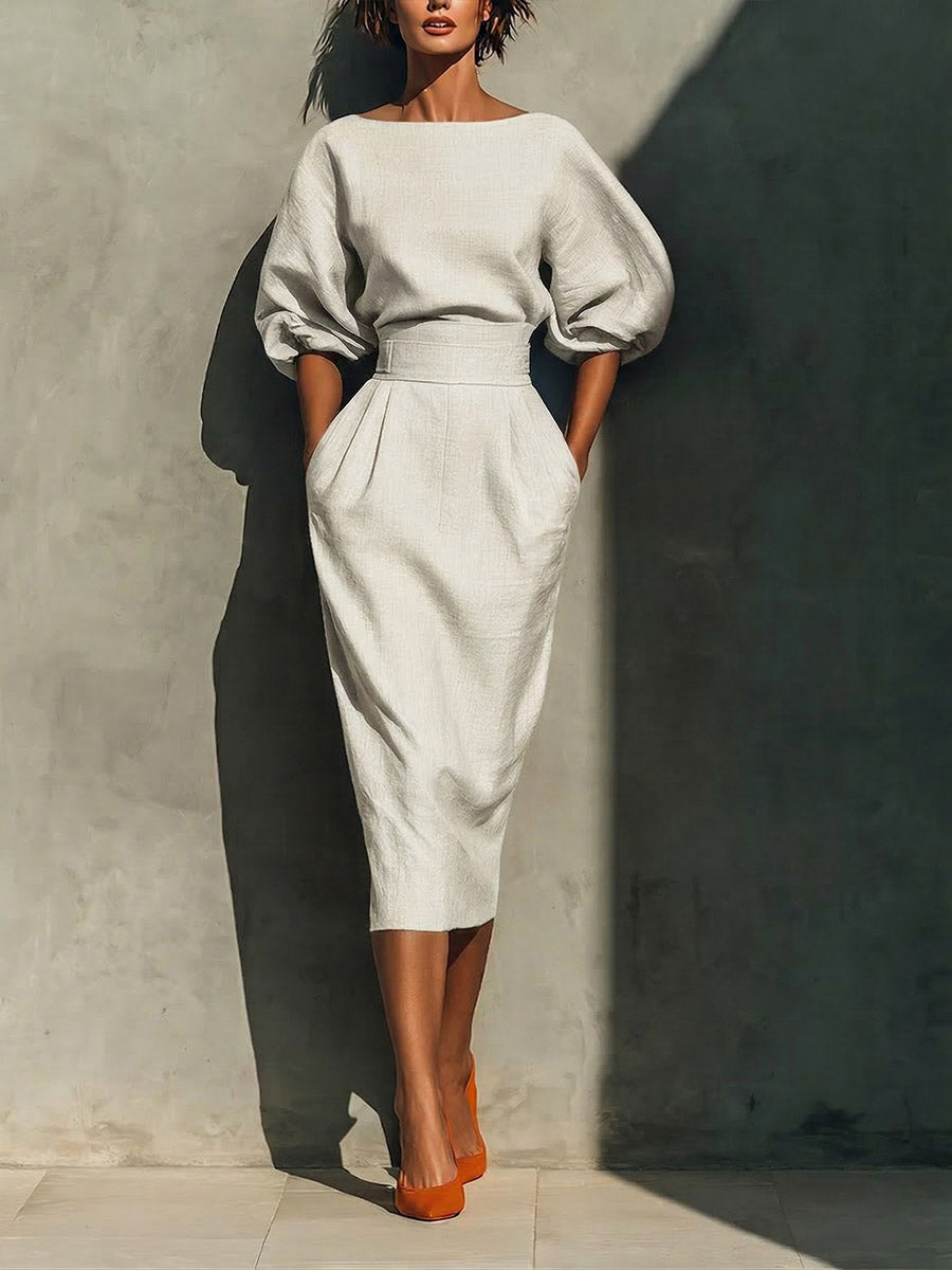Women's Solid-color Round-neck 3/4-sleeve Loose Casual Top & High-waisted Pencil Skirt Cotton-linen Set