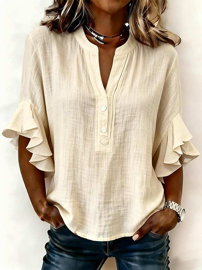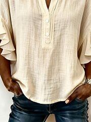 Women'S Solid Color V-Neck Ruffled Cotton And Linen Top