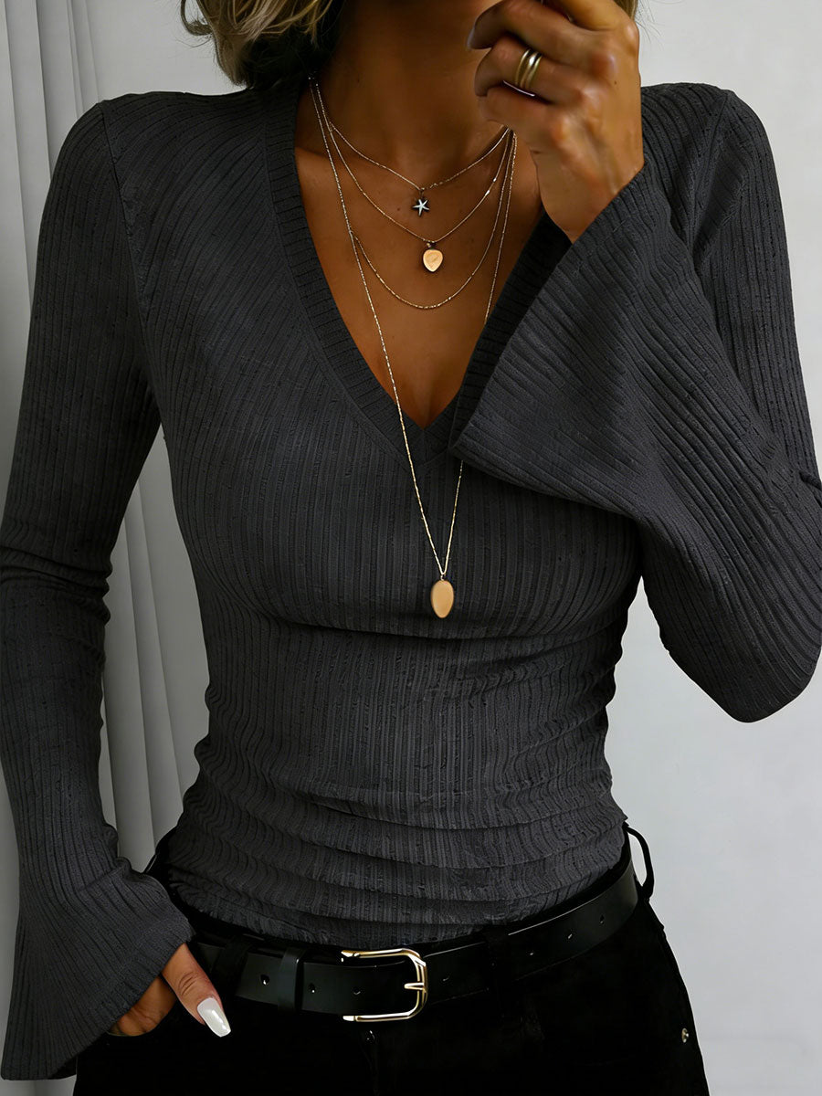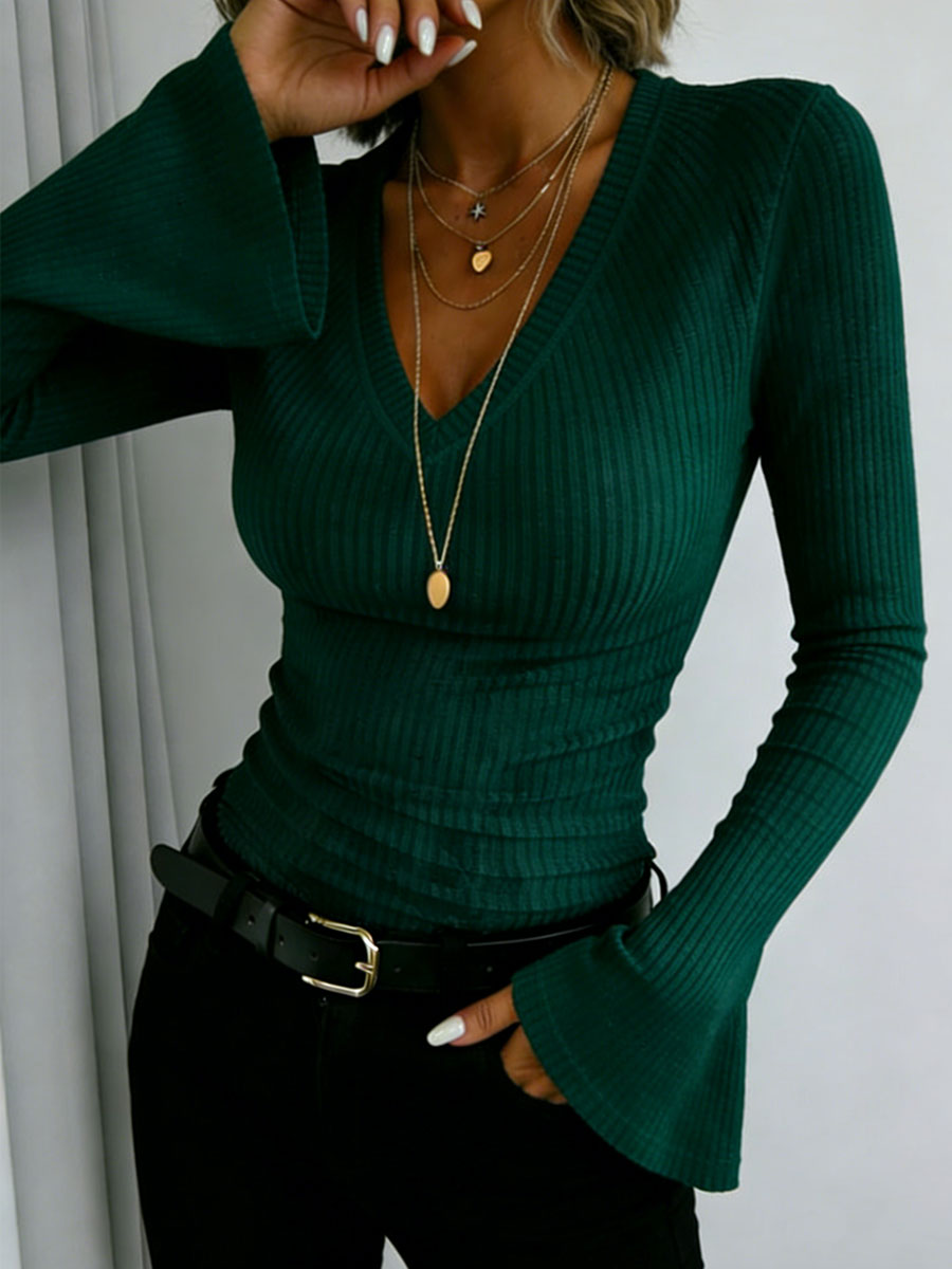 Women's Solid Color Wide Cuff V-neck Long-sleeved Shirt
