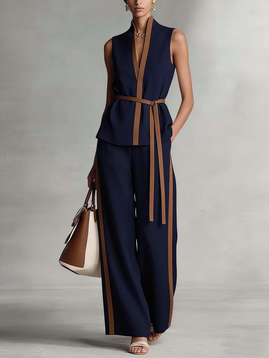 Women's V-neck Sleeveless Casual Loose Cotton Top And High-waisted Casual Loose Wide-leg Cotton Suit