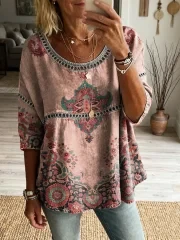 Women's Vintage Ethnic Floral Art Print Casual Round Neck Cutout Top
