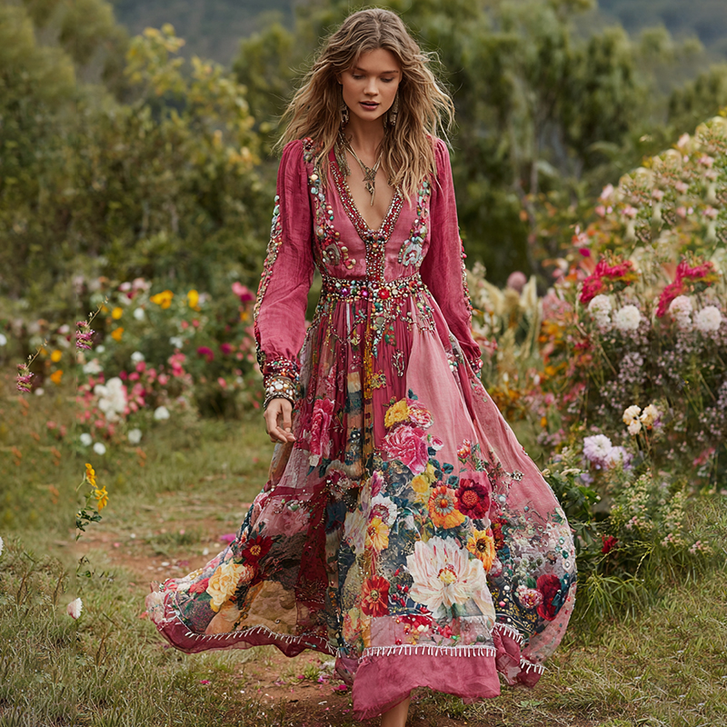 Women's Vintage Floral Art Print V-neck Long Sleeve Maxi Dress