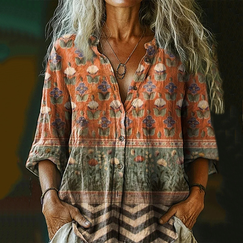 Women's Vintage Floral Collage Art Pattern Print Casual Cotton And Linen Shirt