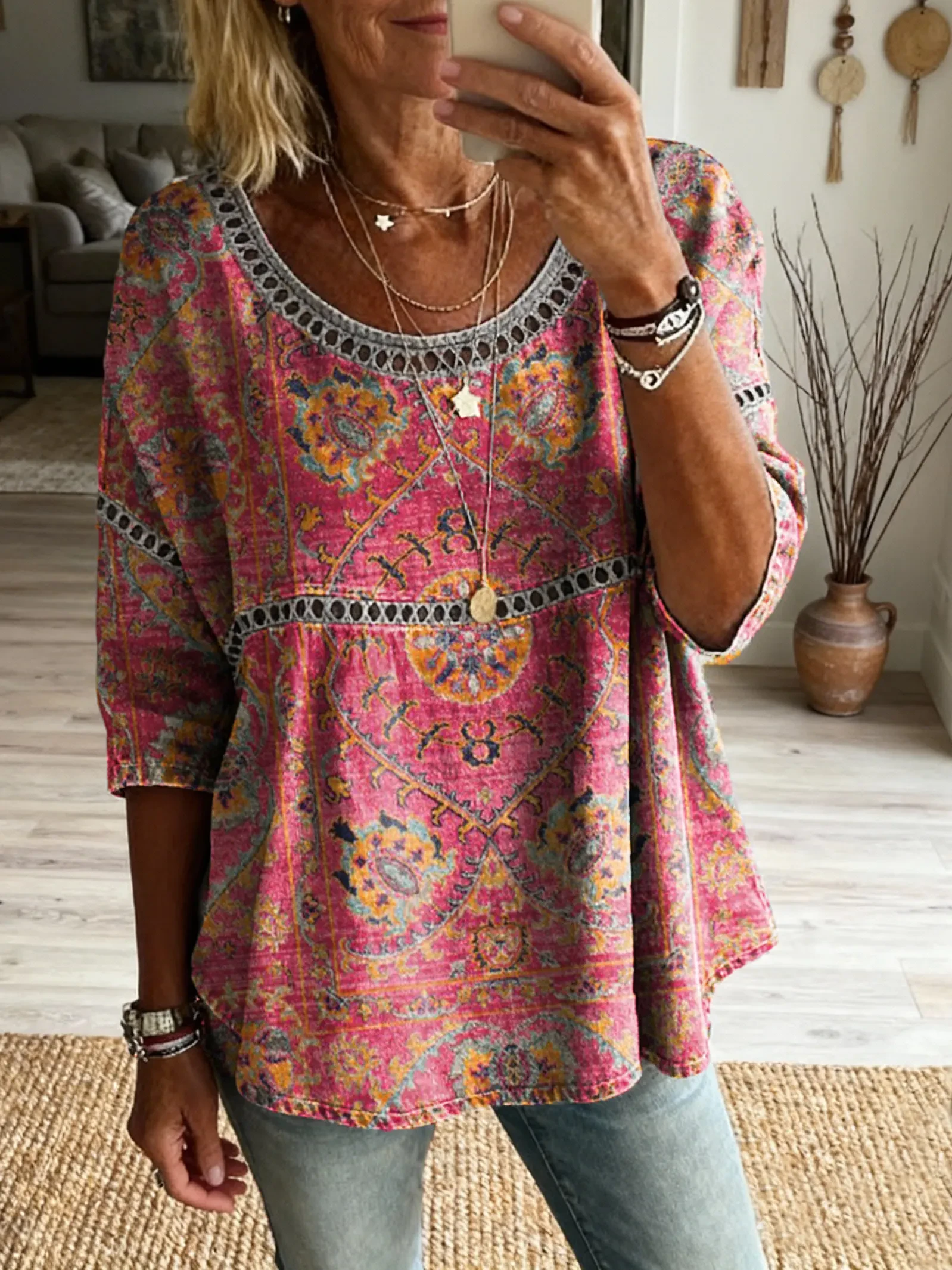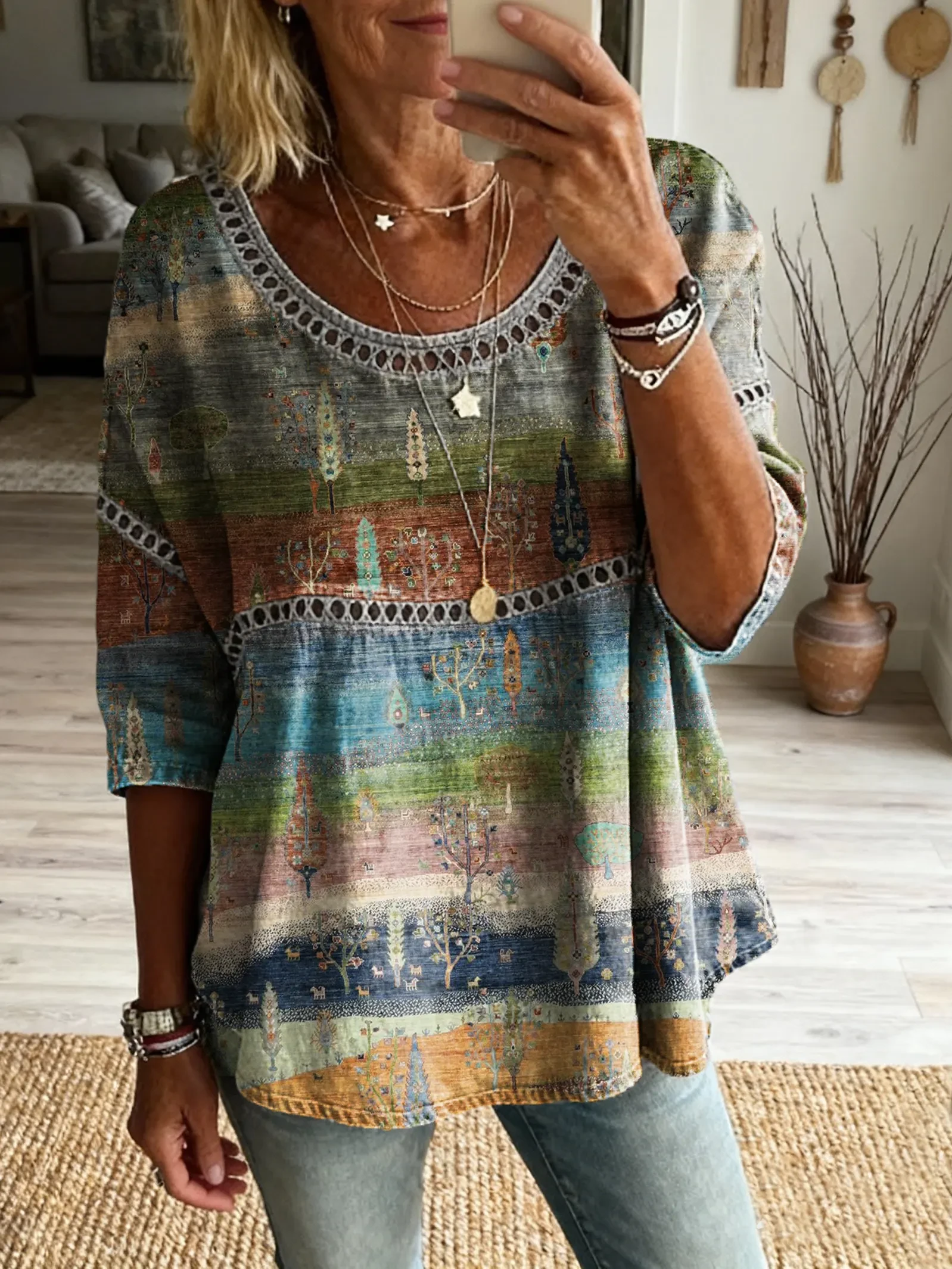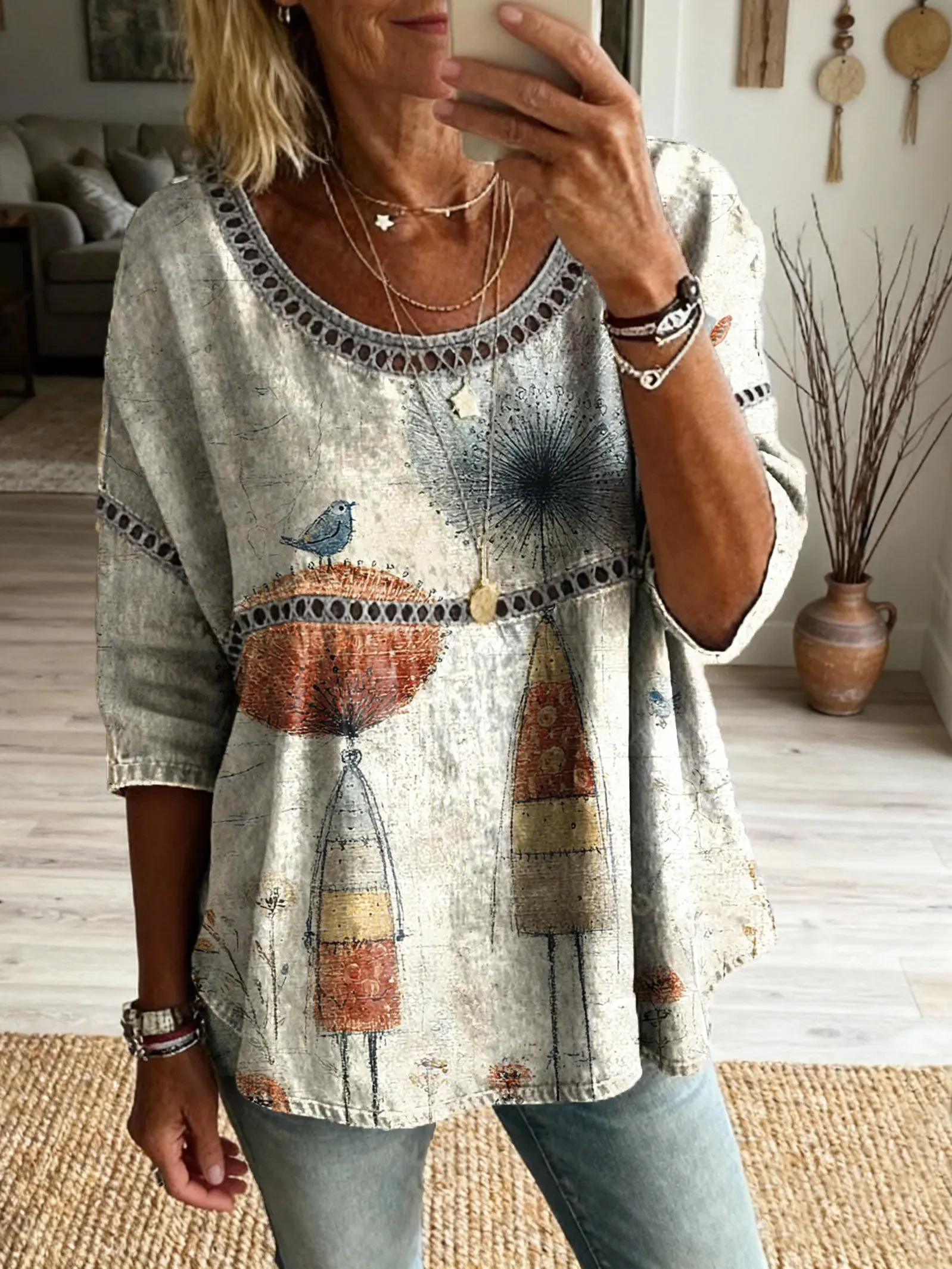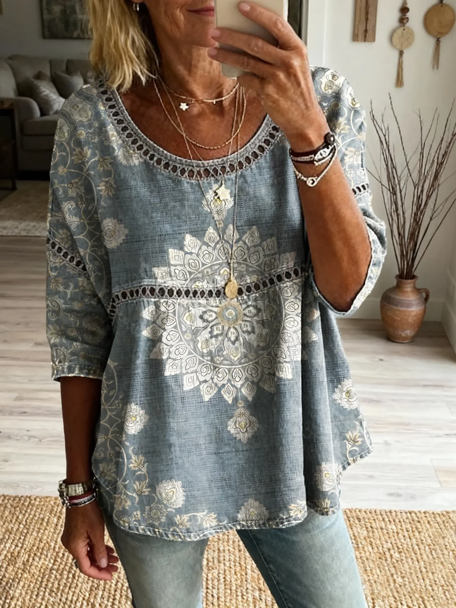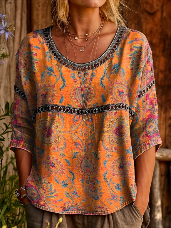 Women's Vintage-style Hippie Pattern Art Print Casual Round Neck Cutout Top