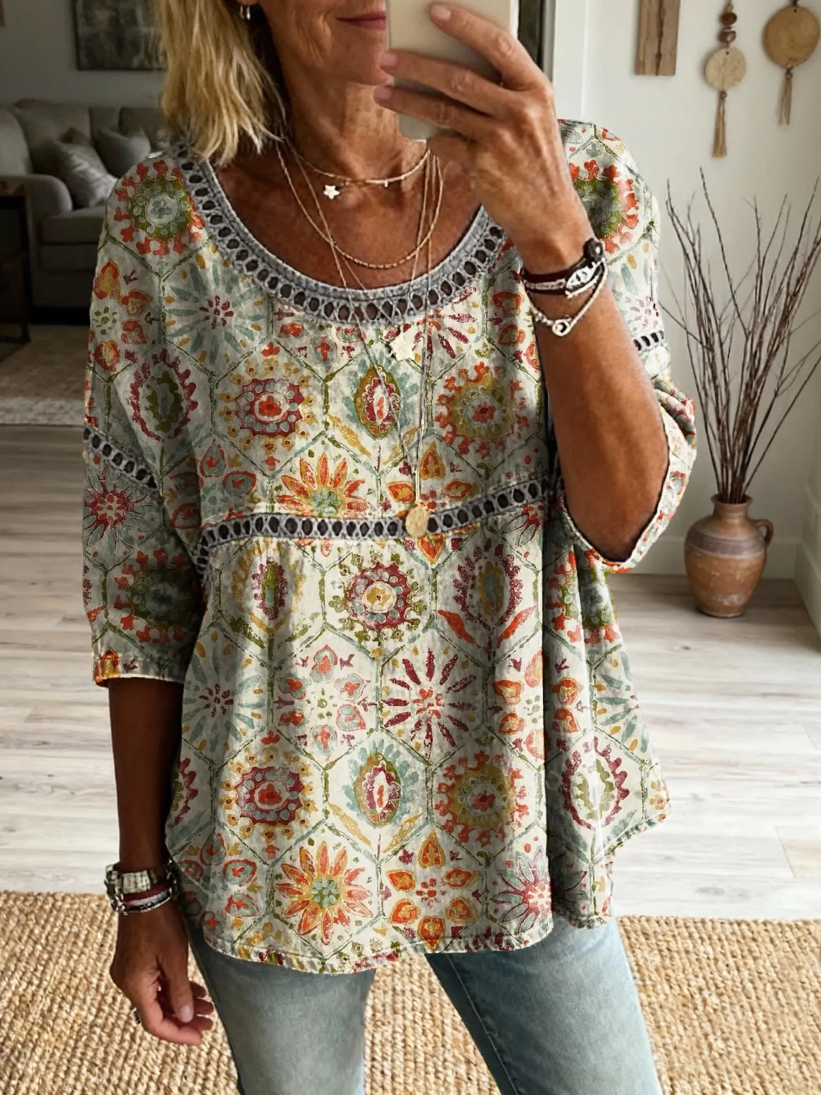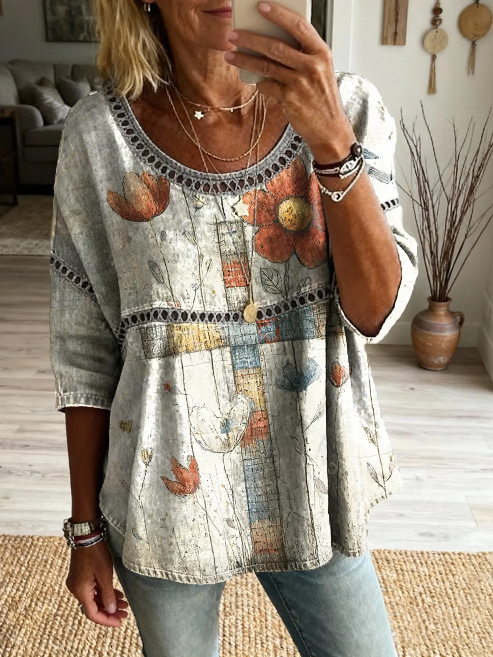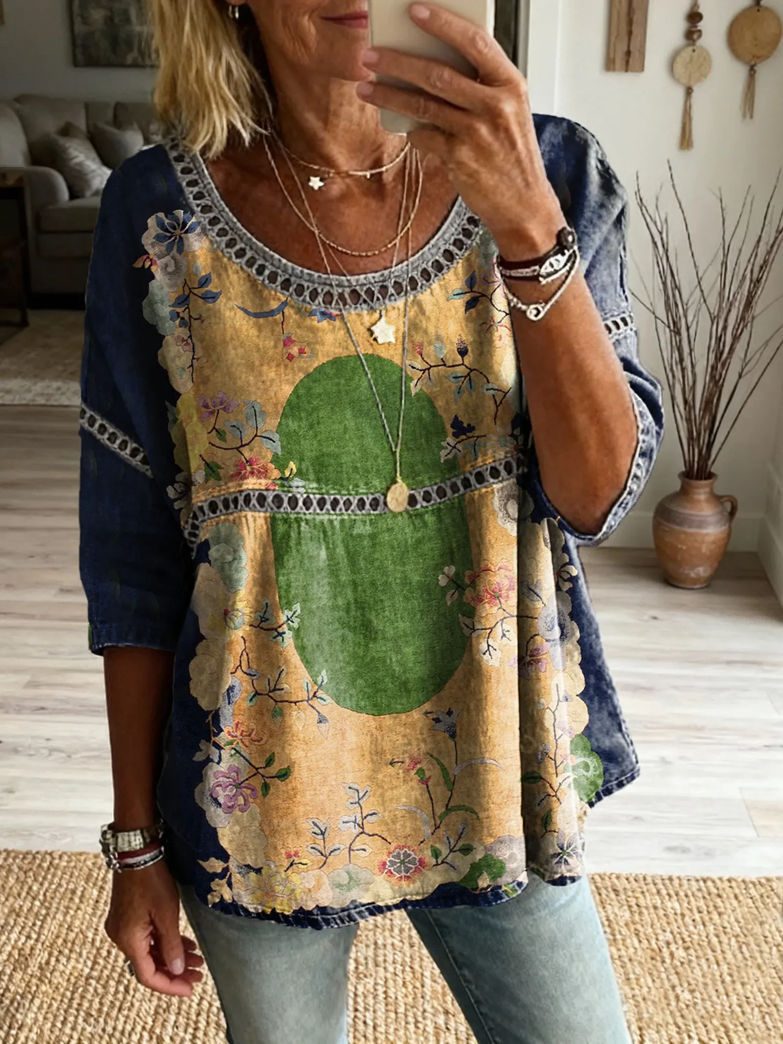 Women's Bohemian style floral patchwork art print casual round neck cutout top