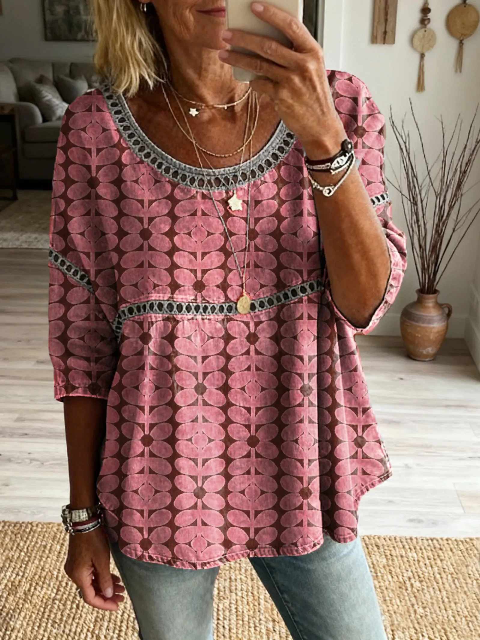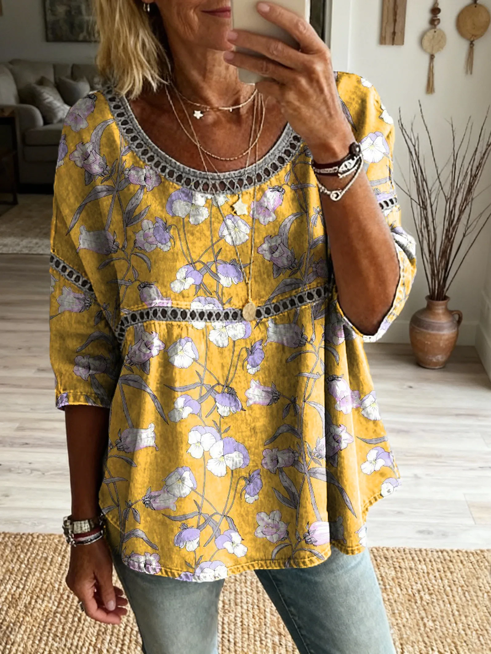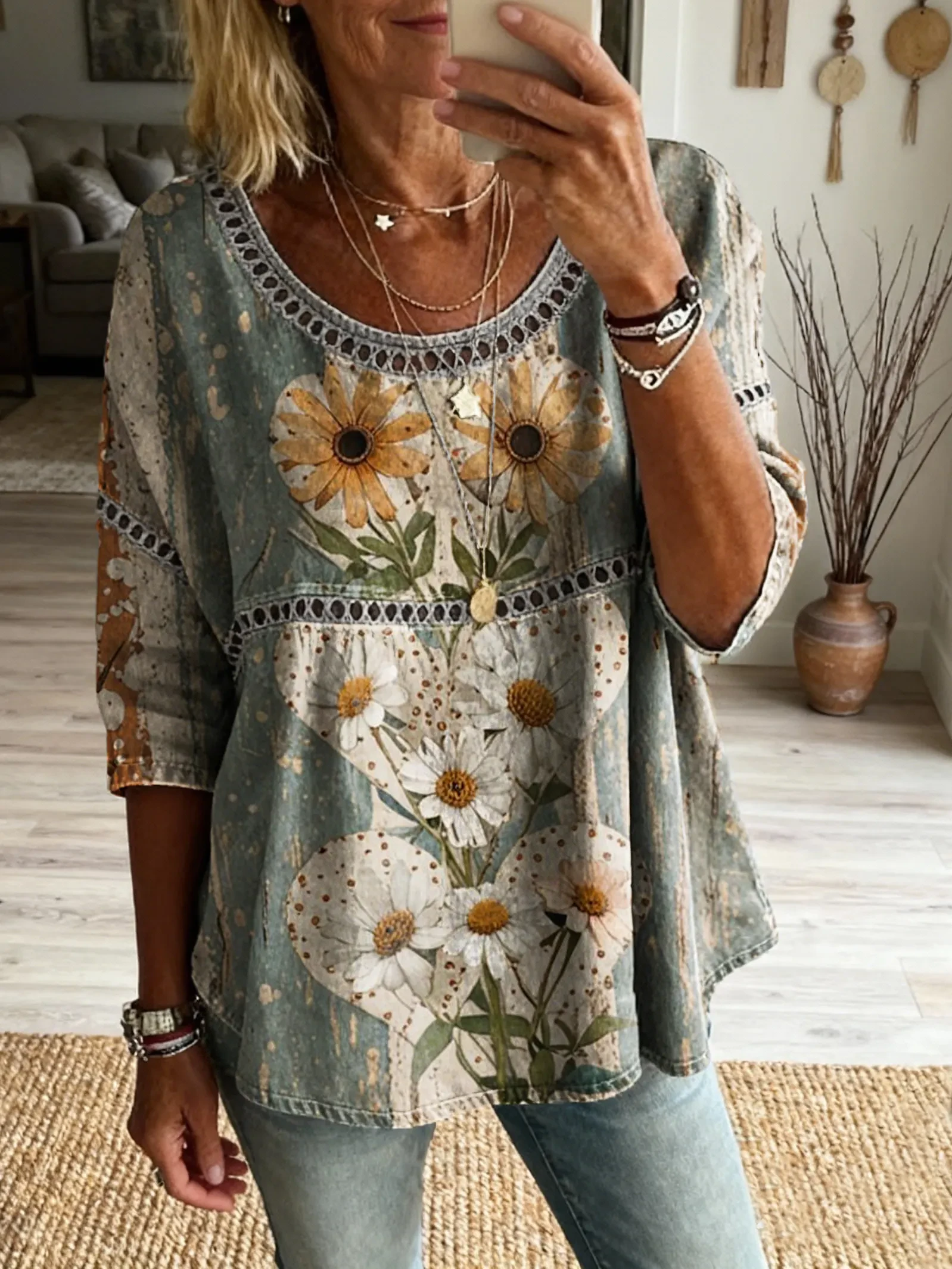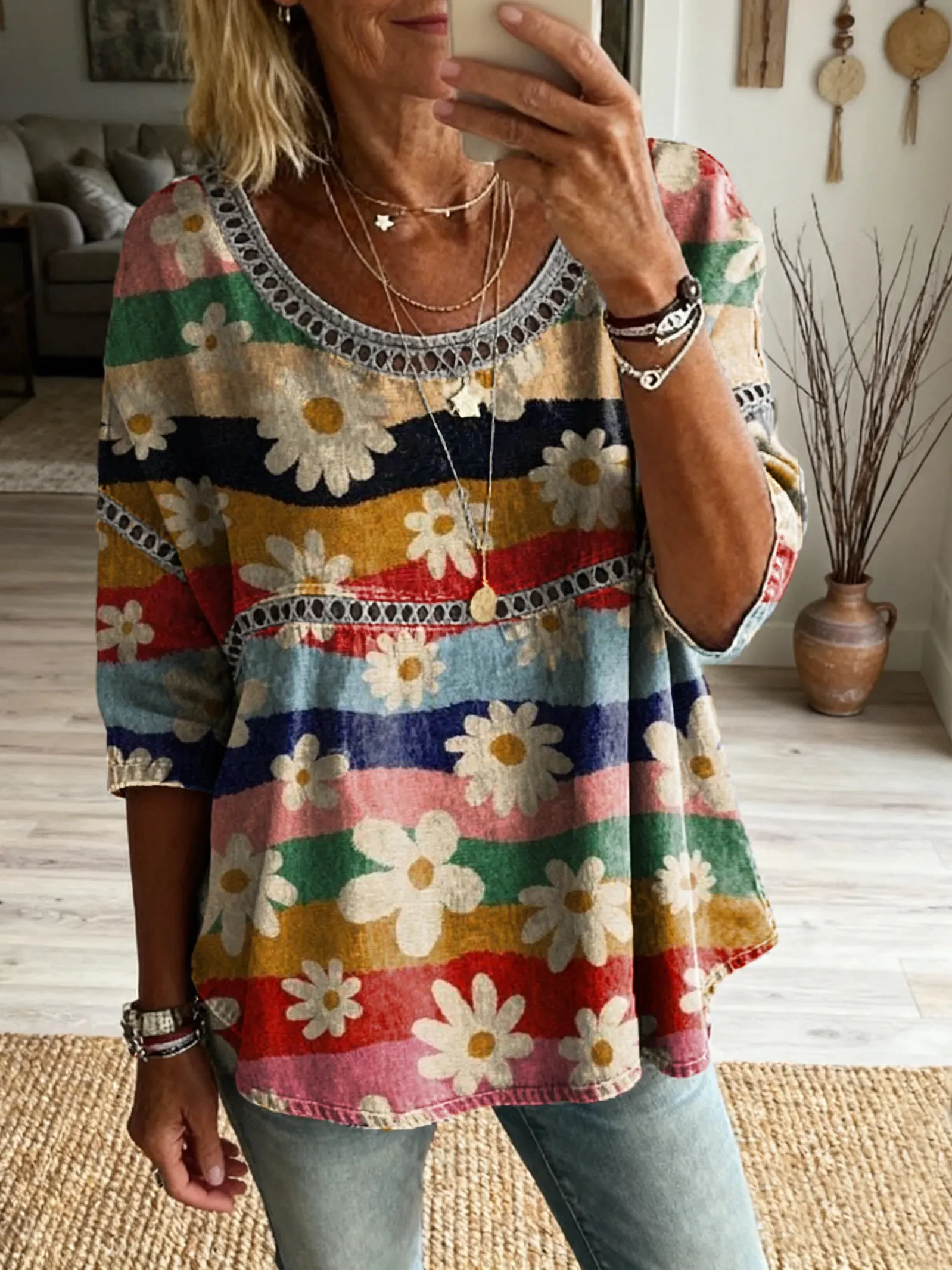 Women's Bohemian style floral patchwork art print casual round neck cutout top