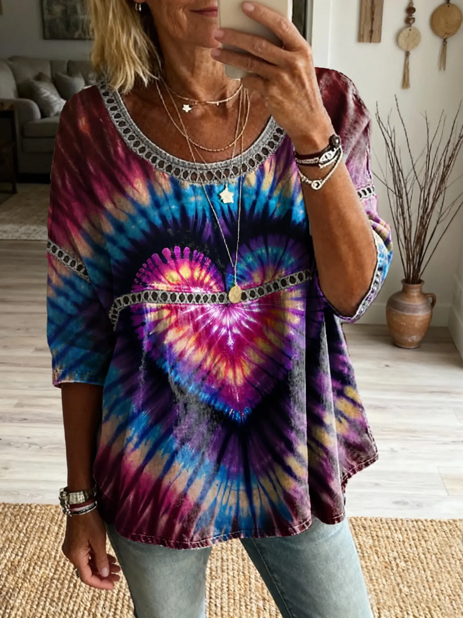 Women's Hippie Retro Tie-dye Art Print Casual Round Neck Cutout Top