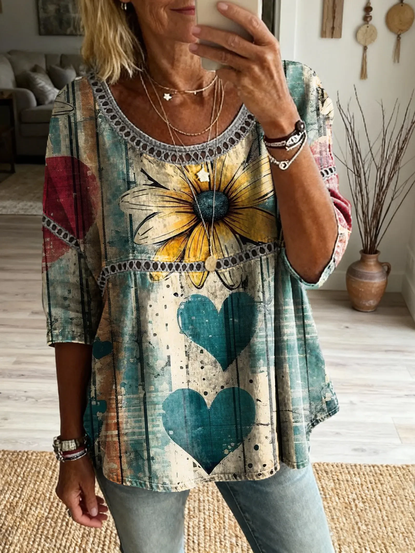 Ethnicity Bohemia Flowers Love Women's Art Print Casual Round Neck Cutout Top