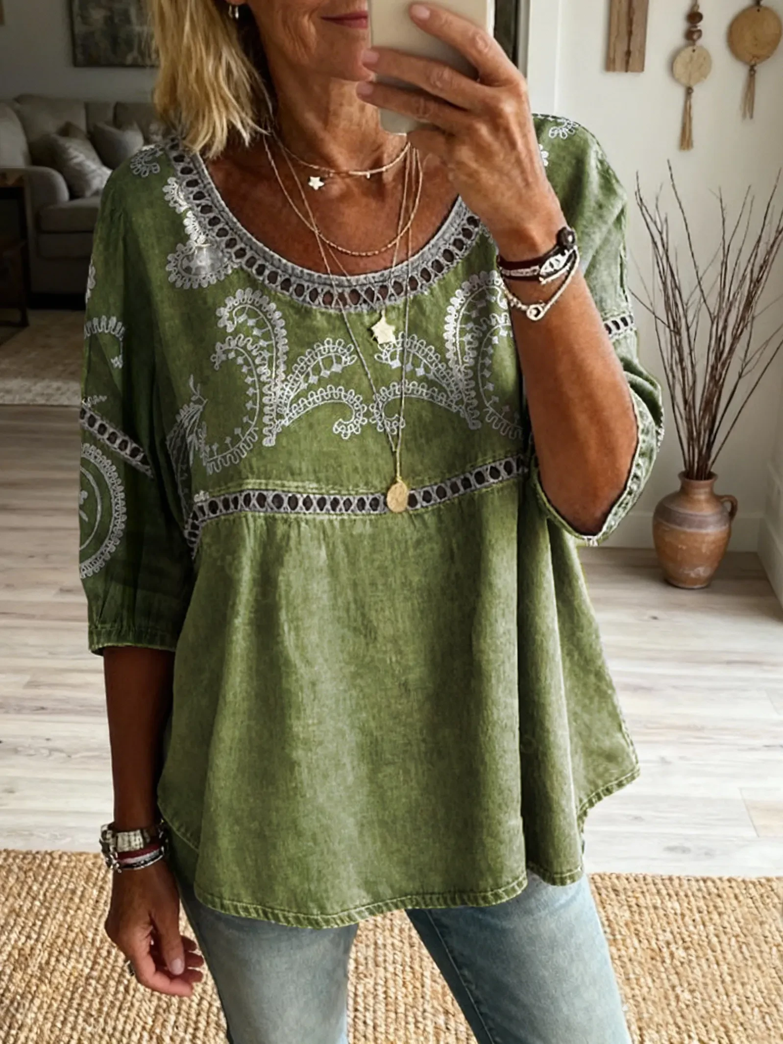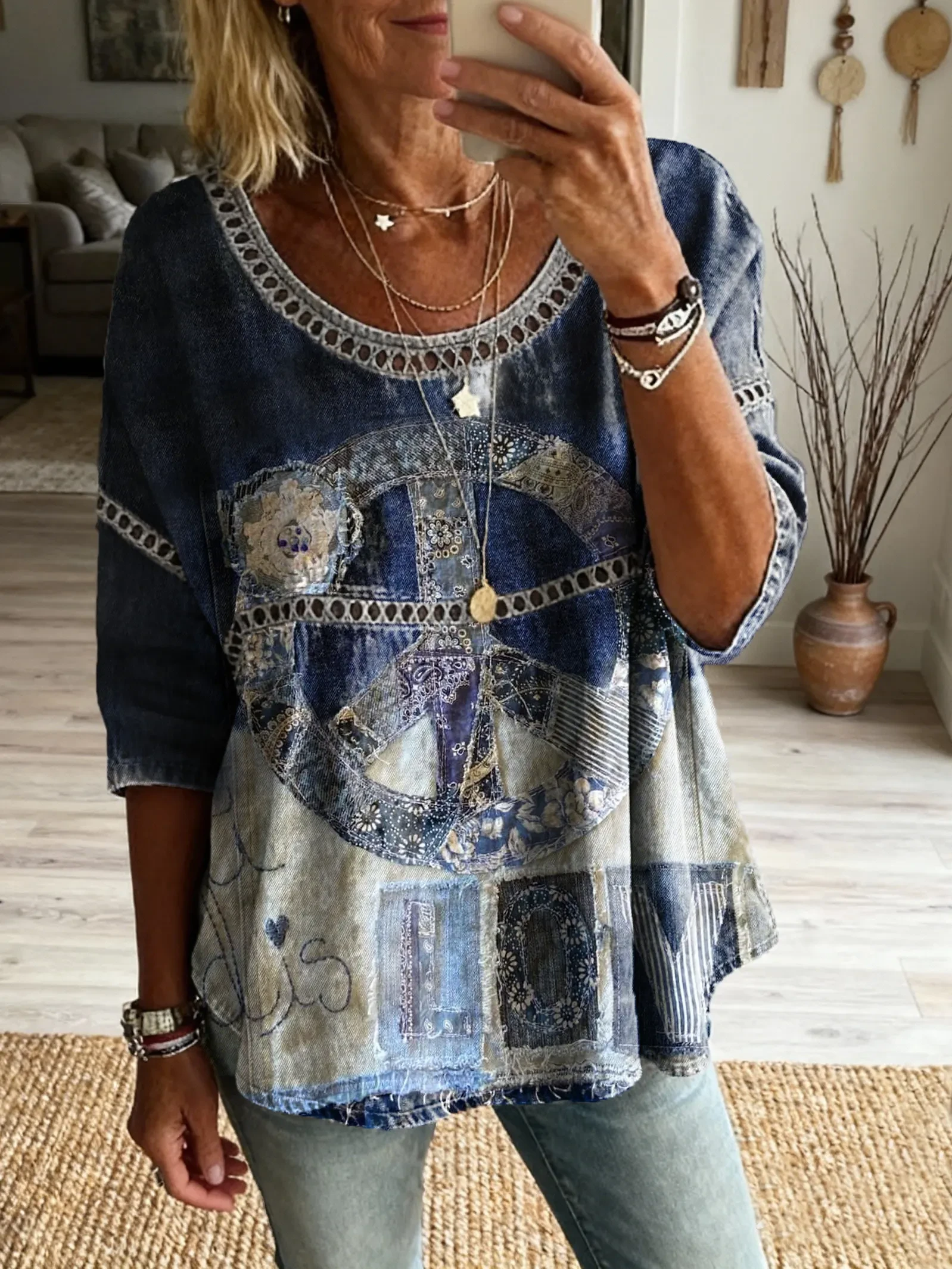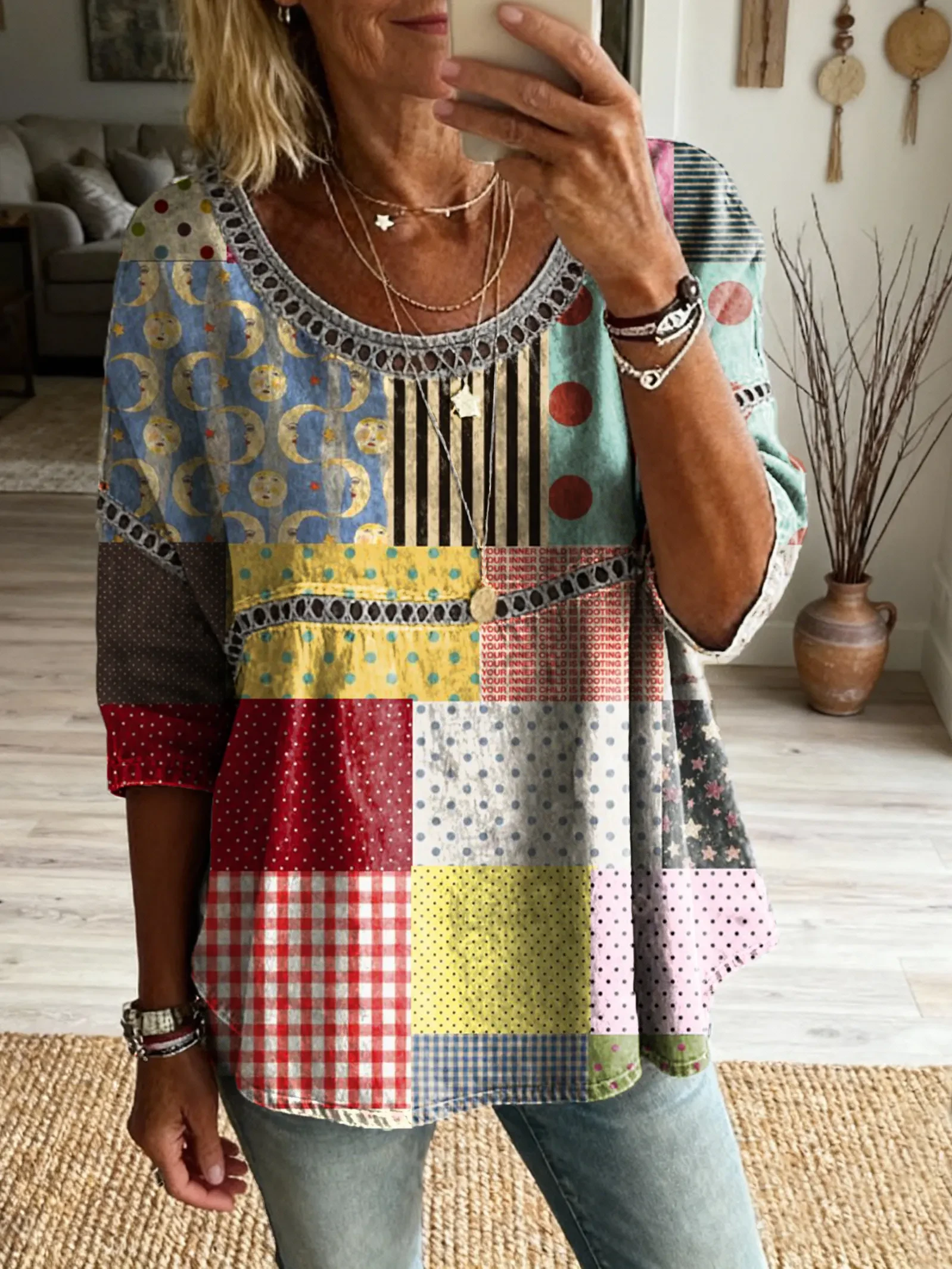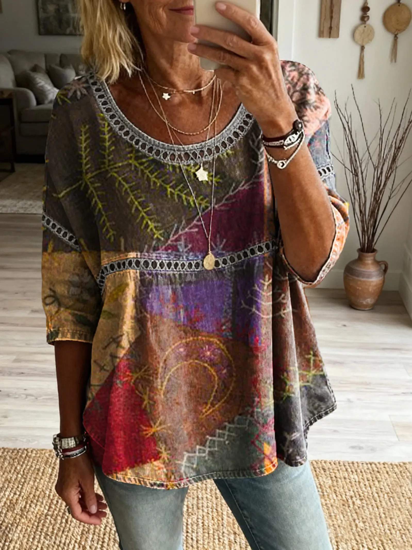 Women's Hippie Style Patchwork Textured Art Print Casual Round Neck Cutout Top