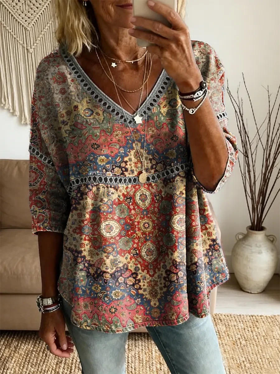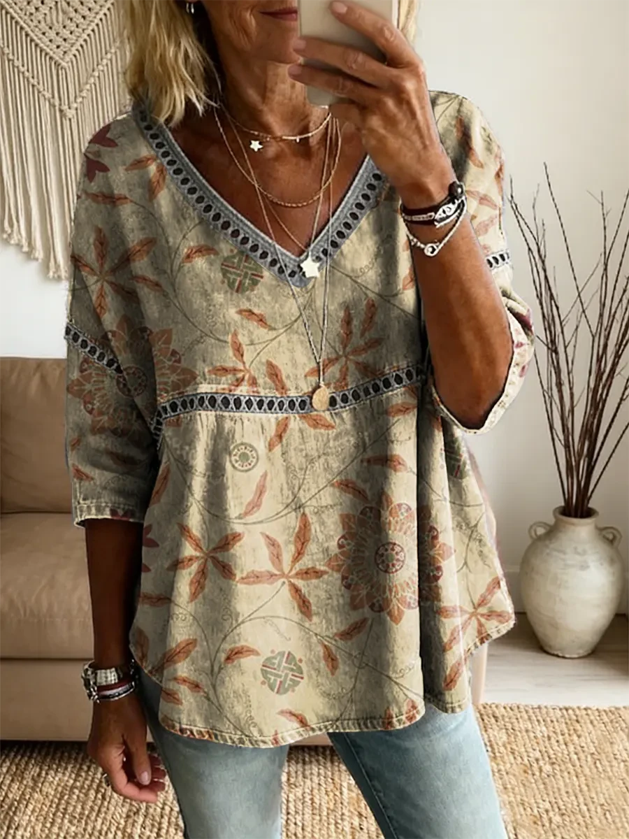 Ethnicity Bohemian Flowers Women's Vintage Art Print Casual V Neck Cutout Top