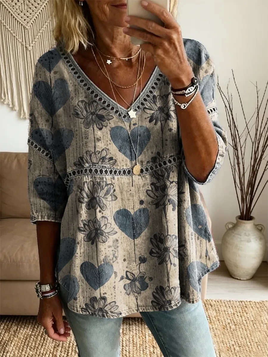 Ethnicity Bohemia Love Women's Vintage Art Print Casual V Neck Cutout Top