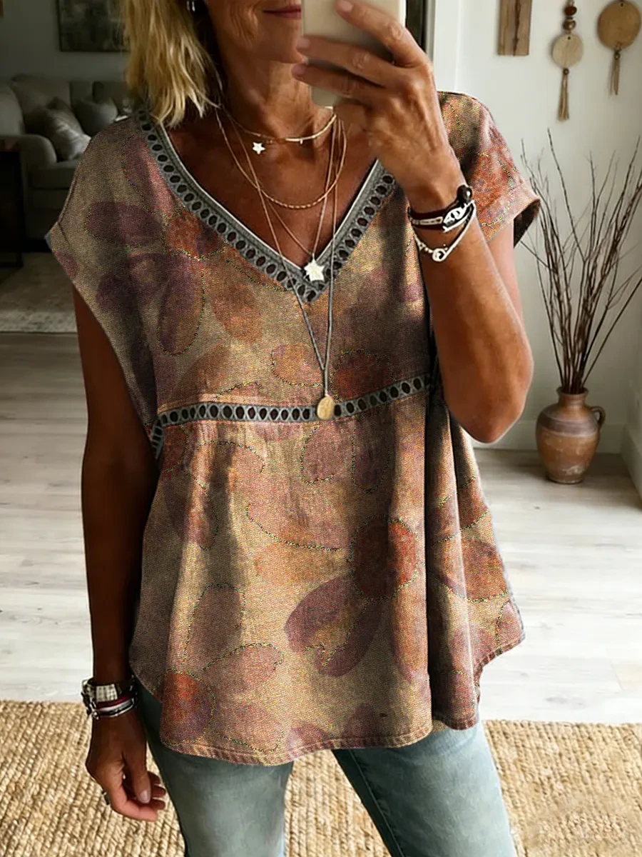 Ethnicity Flowers Women's Vintage Art Print Casual Short-sleeved V Neck Cutout Top