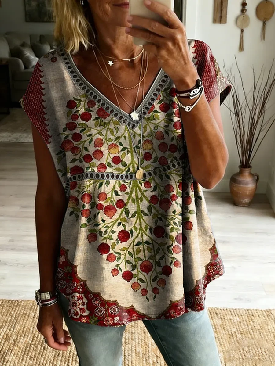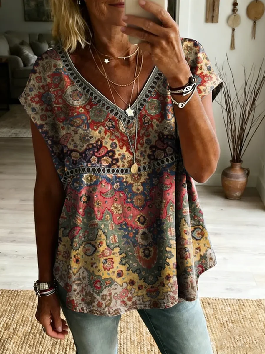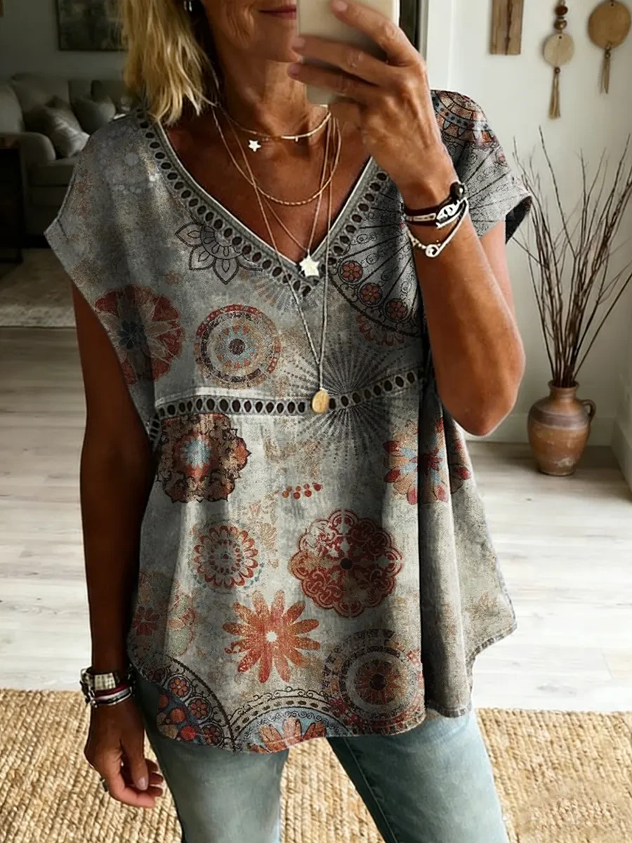 Ethnicity Bohemia Geometry Flowers Women's Vintage Art Print Casual Short-sleeved V Neck Cutout Top