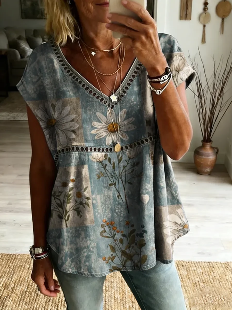 Ethnicity Bohemian Style Flowers Women's Vintage Art Print Casual Short-sleeved V Neck Cutout Top