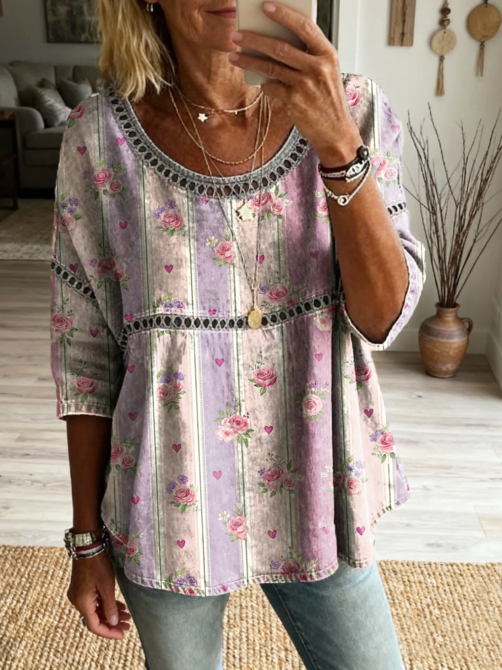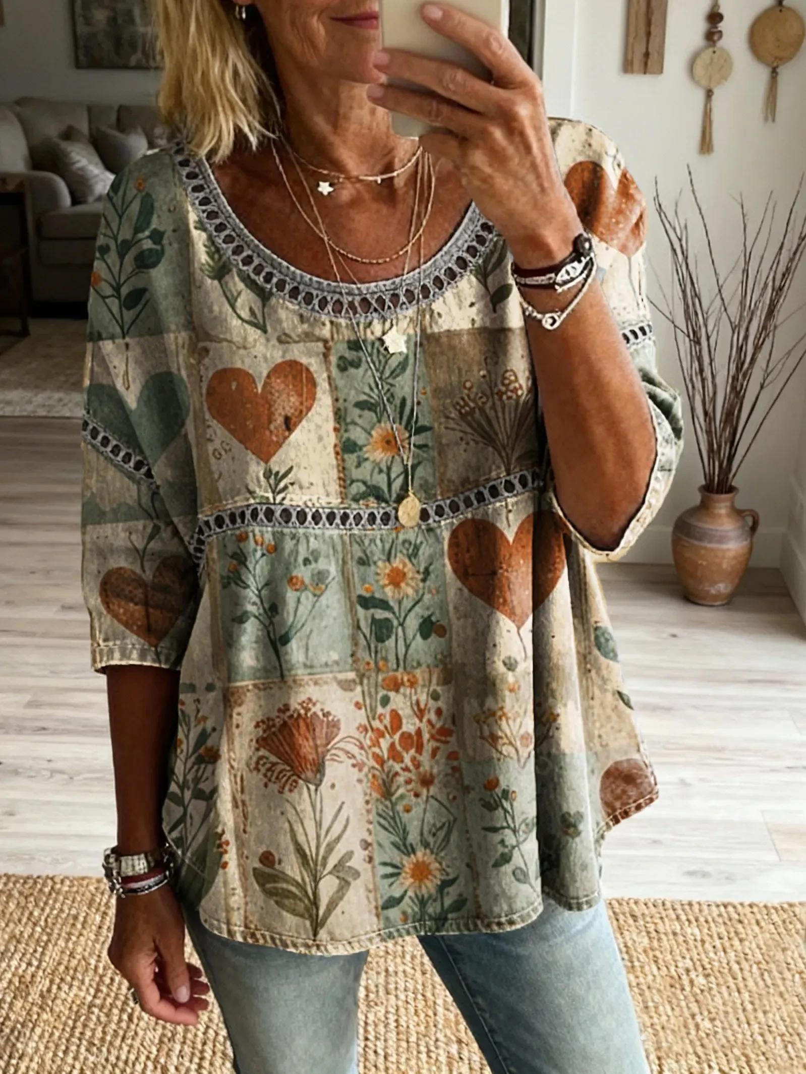 Ethnicity Bohemian Flowers Love Patchwork Women's Vintage Art Print Casual Round Neck Cutout Top