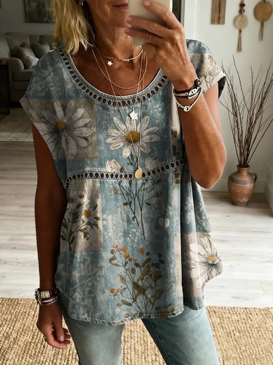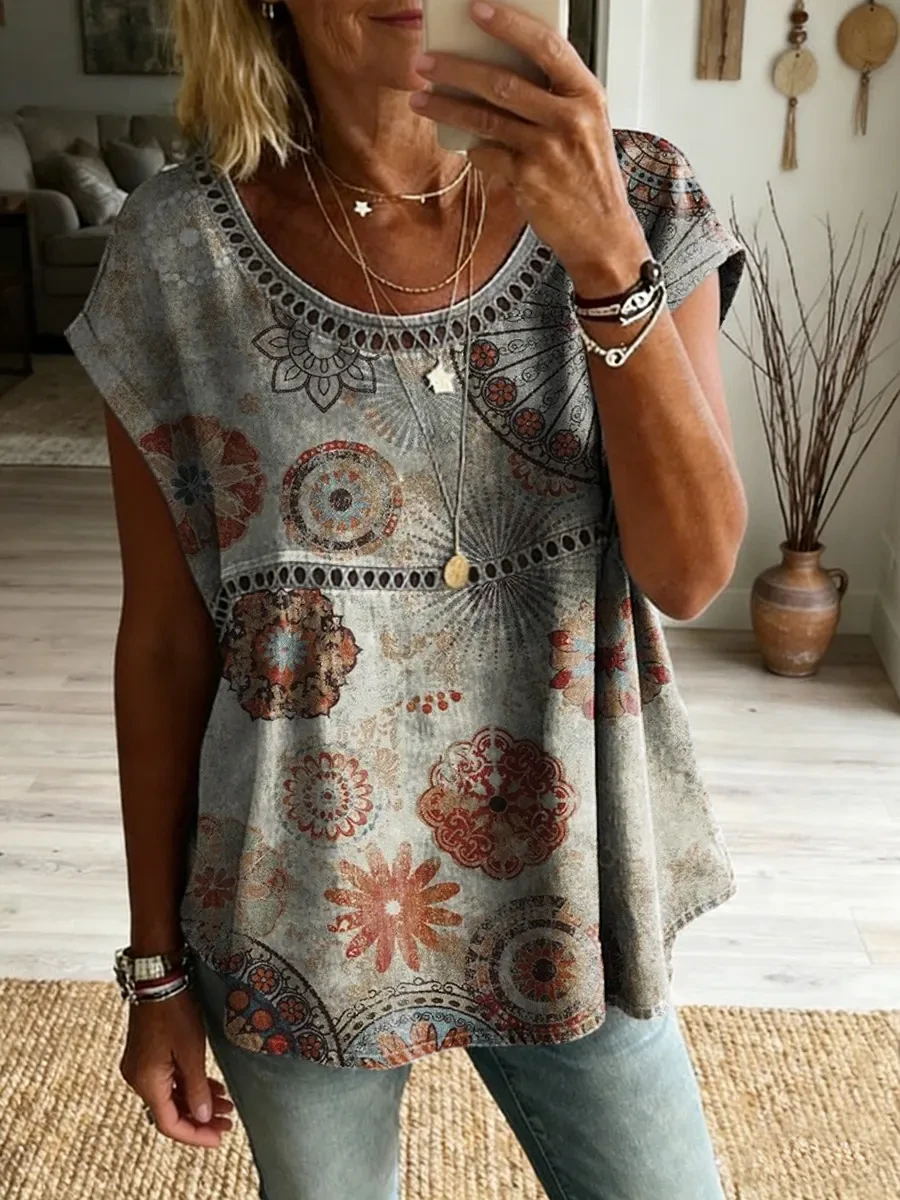Ethnicity Bohemian Style Flowers Women's Vintage Art Print Casual Round Neck Short-sleeved Cutout Top