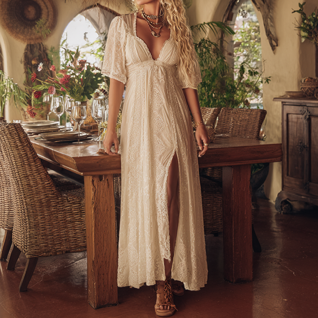 Lace And Chiffon Maxi Dress With Deep V-Neck And Side Slit For Boho Summer Style