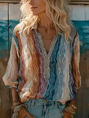Simulated Wave Design Beach Vacation Casual Linen Top