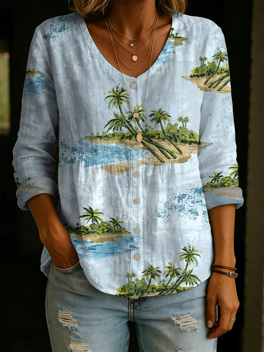 Women's Relaxed Beach Decorative Patterns Linen And Cotton Shirt