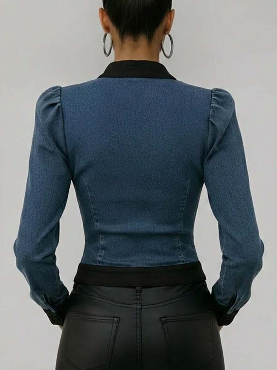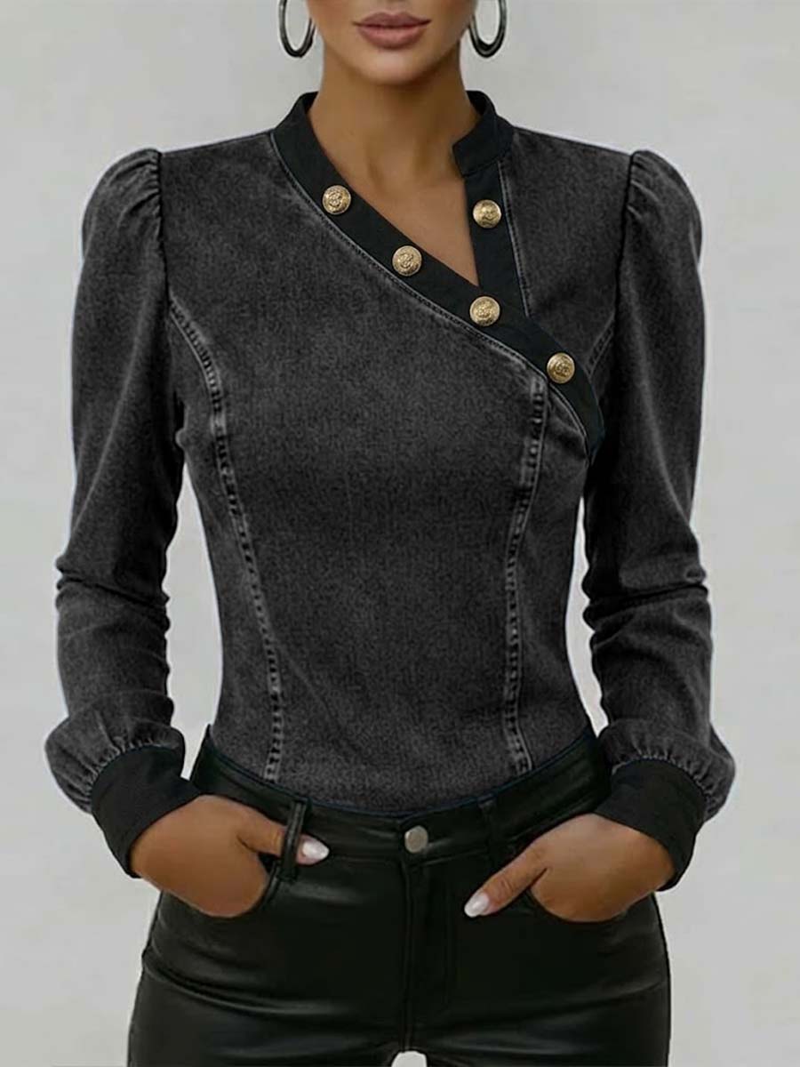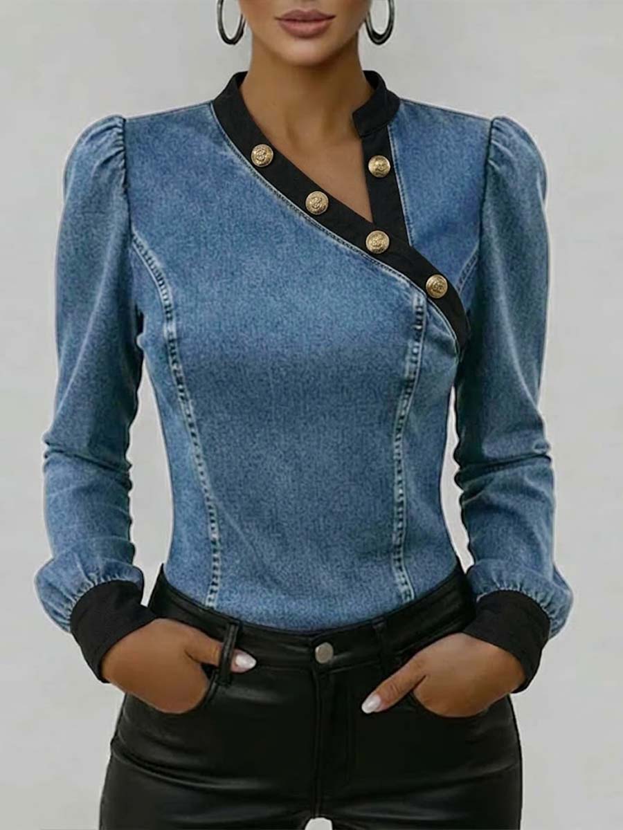 Women's Stand Collar Long Sleeve Casual Slim Fit Denim Top