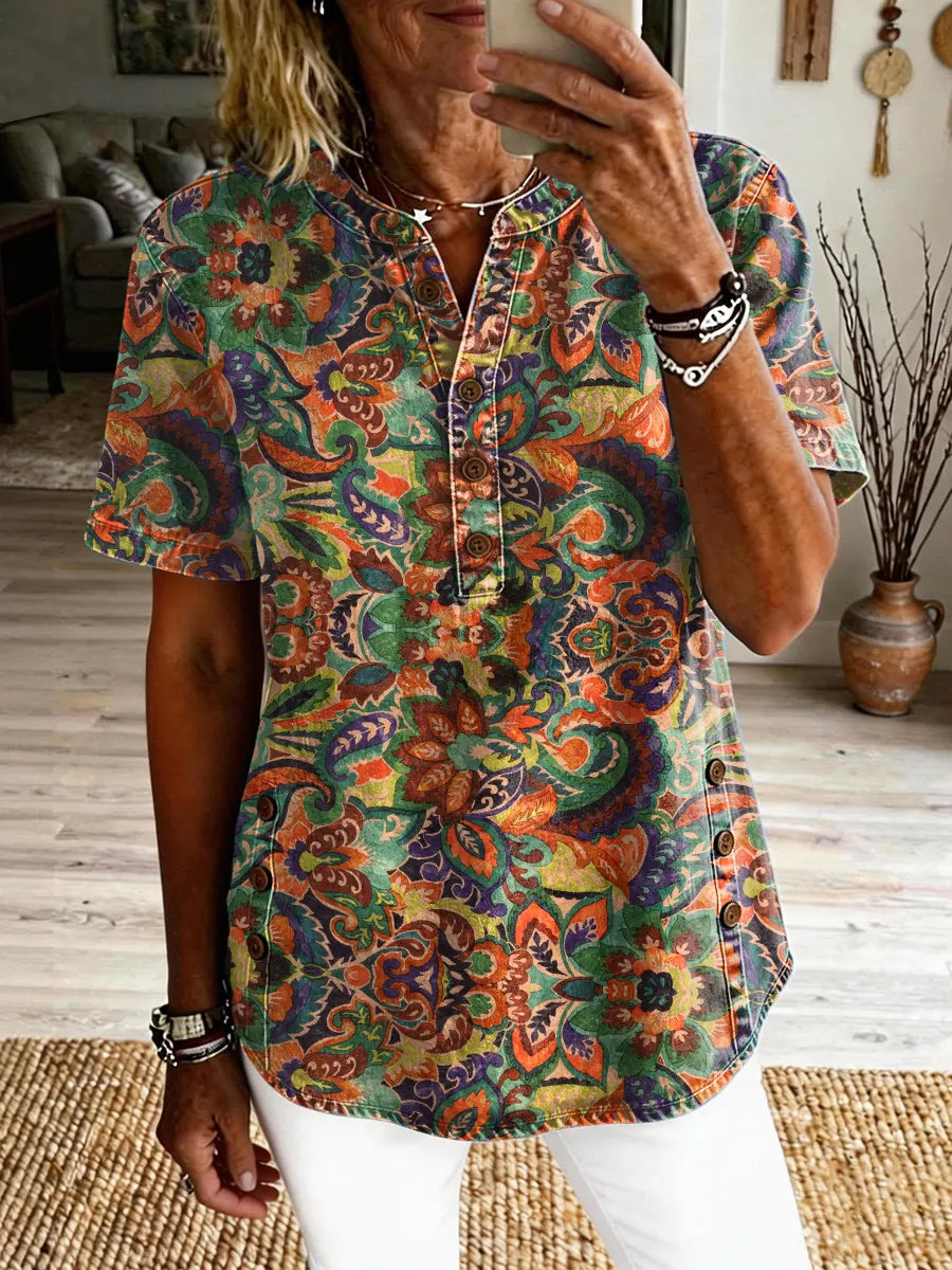 Women's Ethnic Floral Print Button-down Short-sleeved Shirt