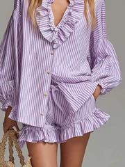 Retro Bohemian Resort Ruffled V-Neck Purple Striped Shirt And Shorts Set