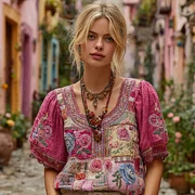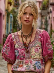 Women's Retro Bohemian Rose And Floral Pattern Embroidered Casual Linen T-shirt